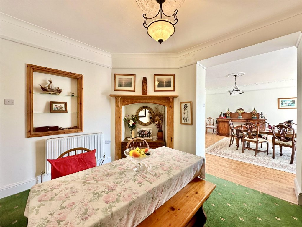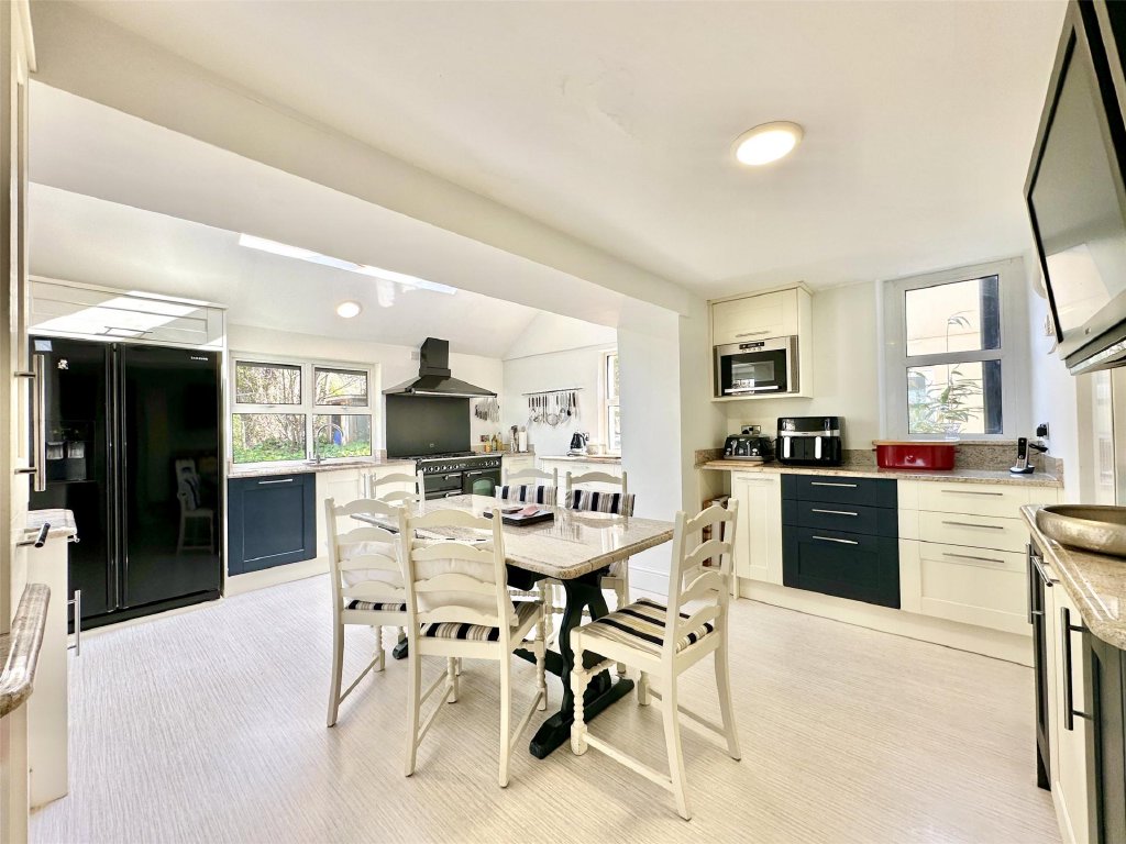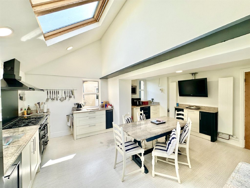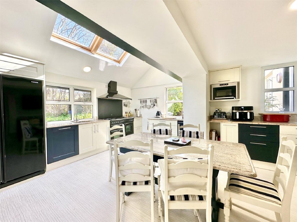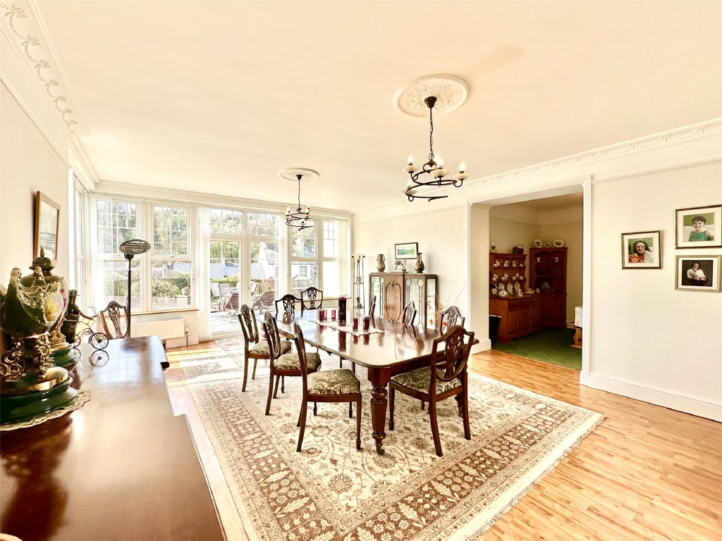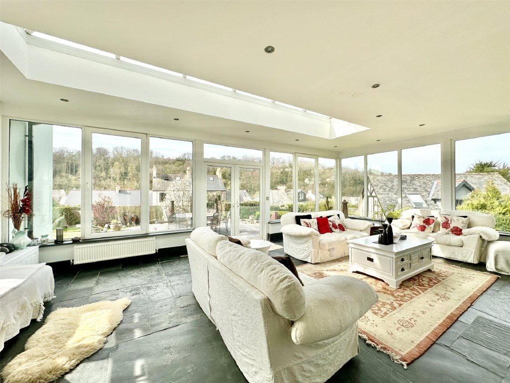 The main residence showcases a wonderful fusion of period features and modern comforts. A wealth of reception space includes the original lounge with its cosy, traditional ambience and a feature fireplace that provides a focal point to the room. The bay window at the front perfectly frames the delightful views. Across the hallway is a separate snug, ideal for quiet relaxation. The snug has glazed double doors that open into the spectacular 26ft x 19ft conservatory/sun lounge—flooded with natural light and perfectly positioned to make the most of the glorious views. A large roof lantern crowns the room, adding to the atmosphere of openness. For those cooler autumnal and winter days, a wood burner set on a slate hearth provides comforting warmth making this stunning room perfect for year-round living. Glazed double doors allow a seamless connection with an expansive front sun terrace blending indoor and outdoor living effortlessly. Complementing this is the impressive 21ft x 15ft dining room extension, a gloriously bright and generous space that lends itself beautifully to entertaining, family gatherings and dinner parties. Again, there is direct access onto the front sun terrace, enabling diners to flow naturally from inside to out as they continue their enjoyment.