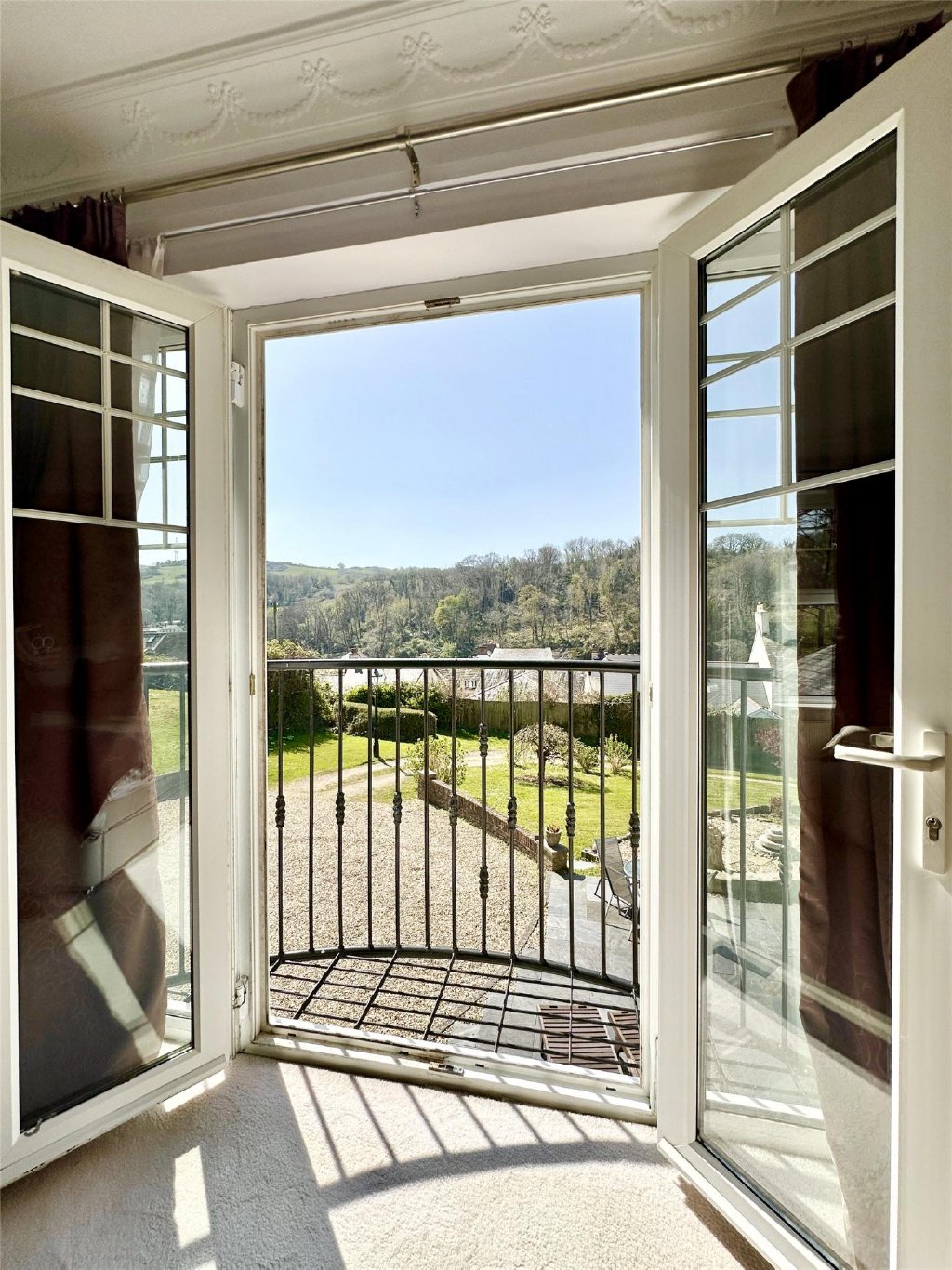 A wide sun terrace stretches across the front of the house and is accessible from the main reception rooms, creating a seamless connection between inside and out and providing a wonderful space for an al-fresco meal, barbecues, sun bathing or simply enjoying the great outdoors whilst soaking up the wonderful views over the village and the wooded valley.