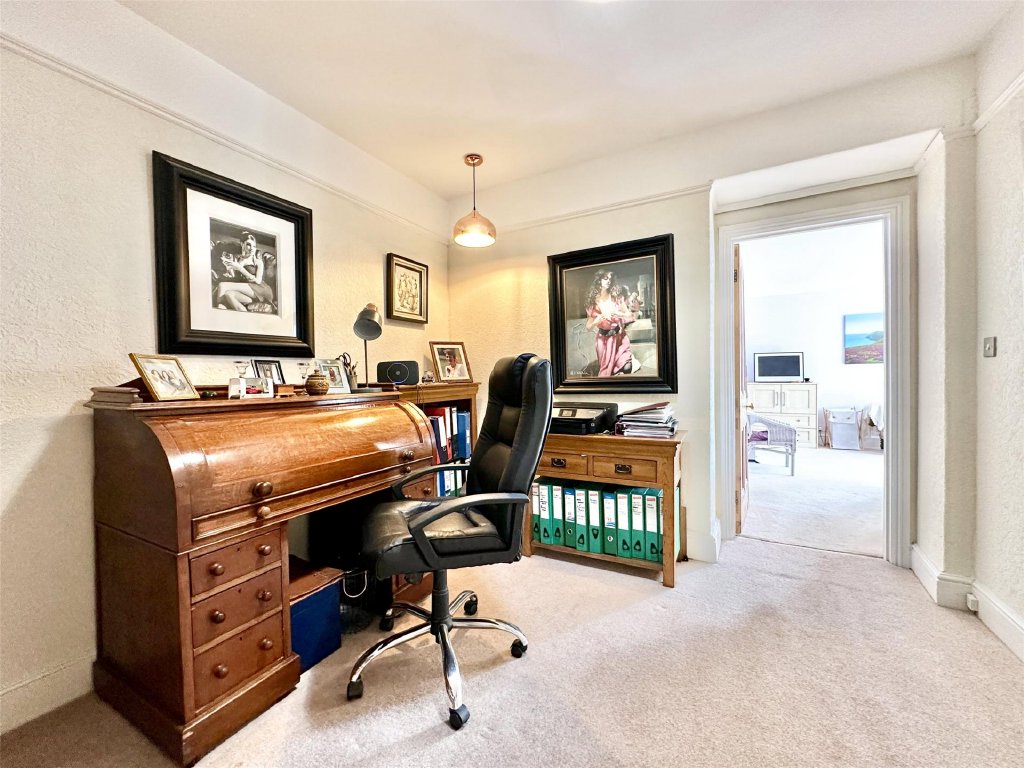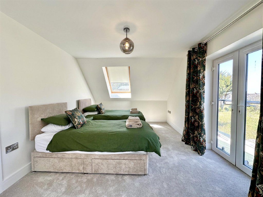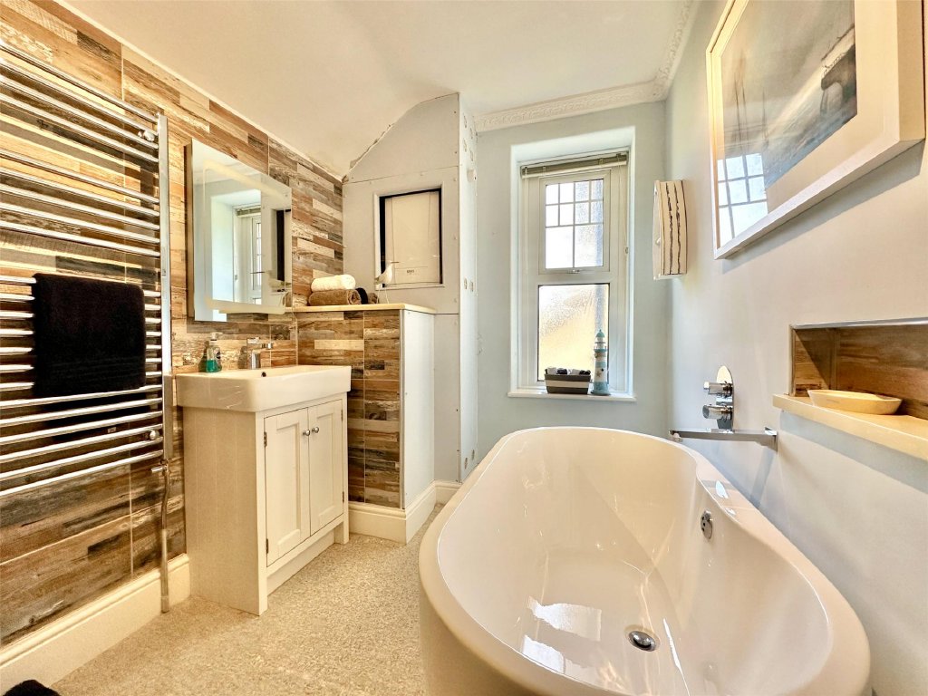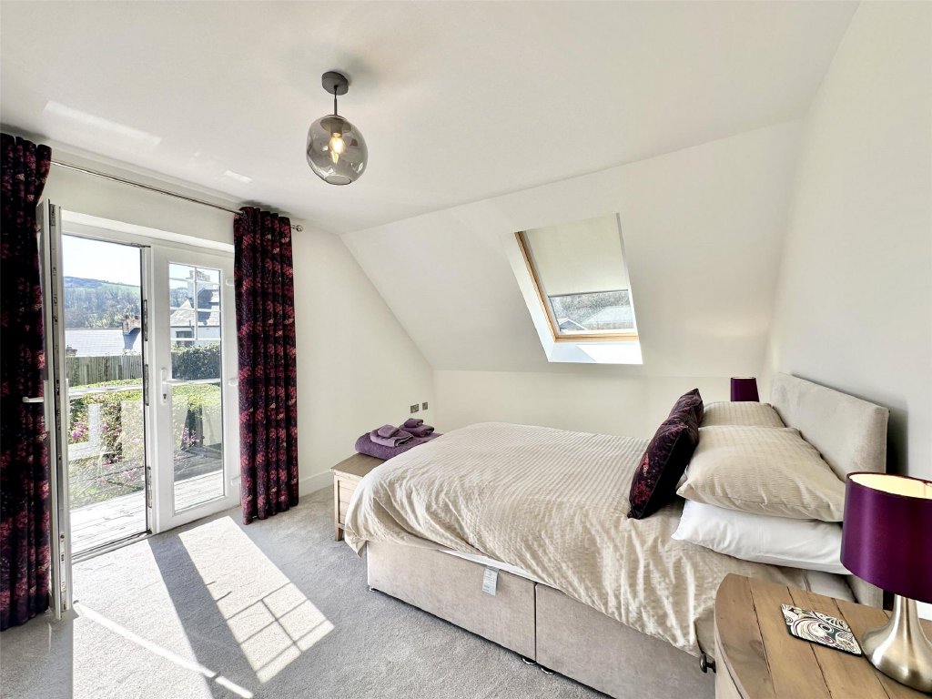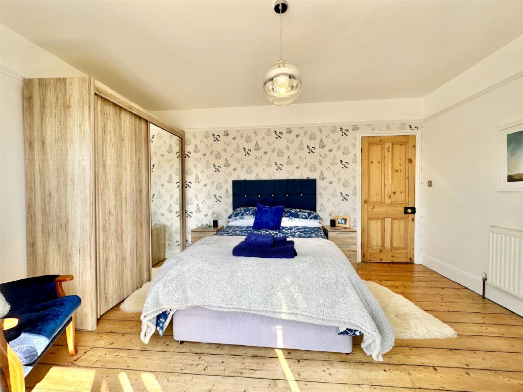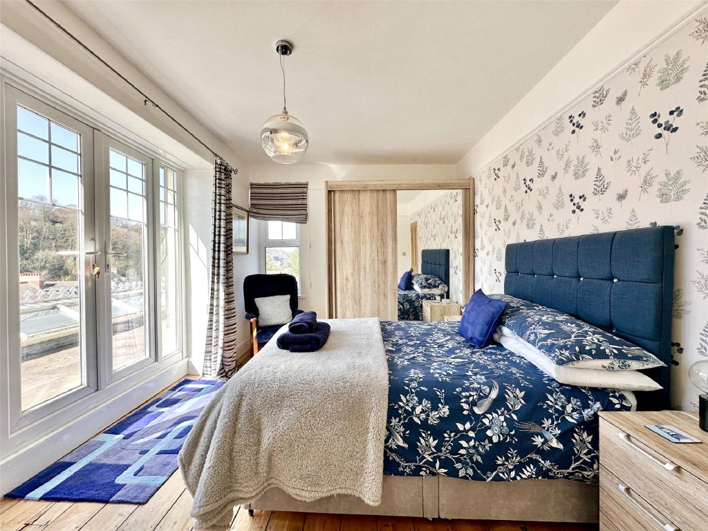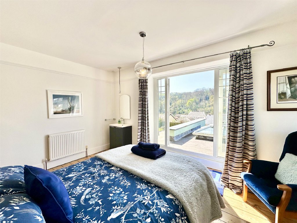 Upstairs, all four generous bedrooms benefit from the captivating views, with the principal suite boasting its own dressing room, en suite bathroom, and an adjoining study—ideal as a nursery or home office. Bedroom two enjoys access to a large roof area offering panoramic views over Combe Martin Bay, the rugged North Devon coastline and the sea beyond—an extraordinary vantage point and a unique feature. A modern family bathroom and separate toilet complete the facilities.