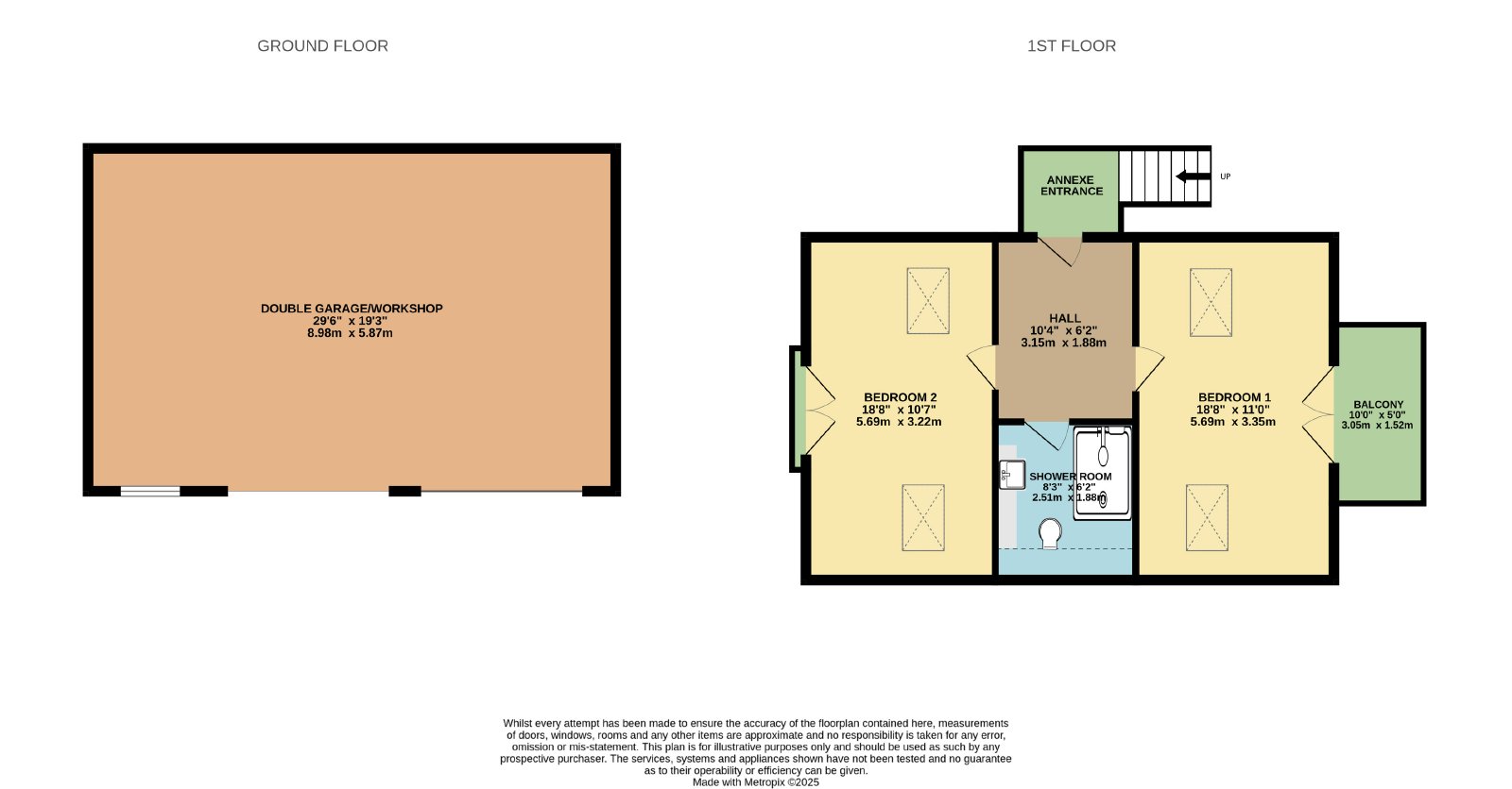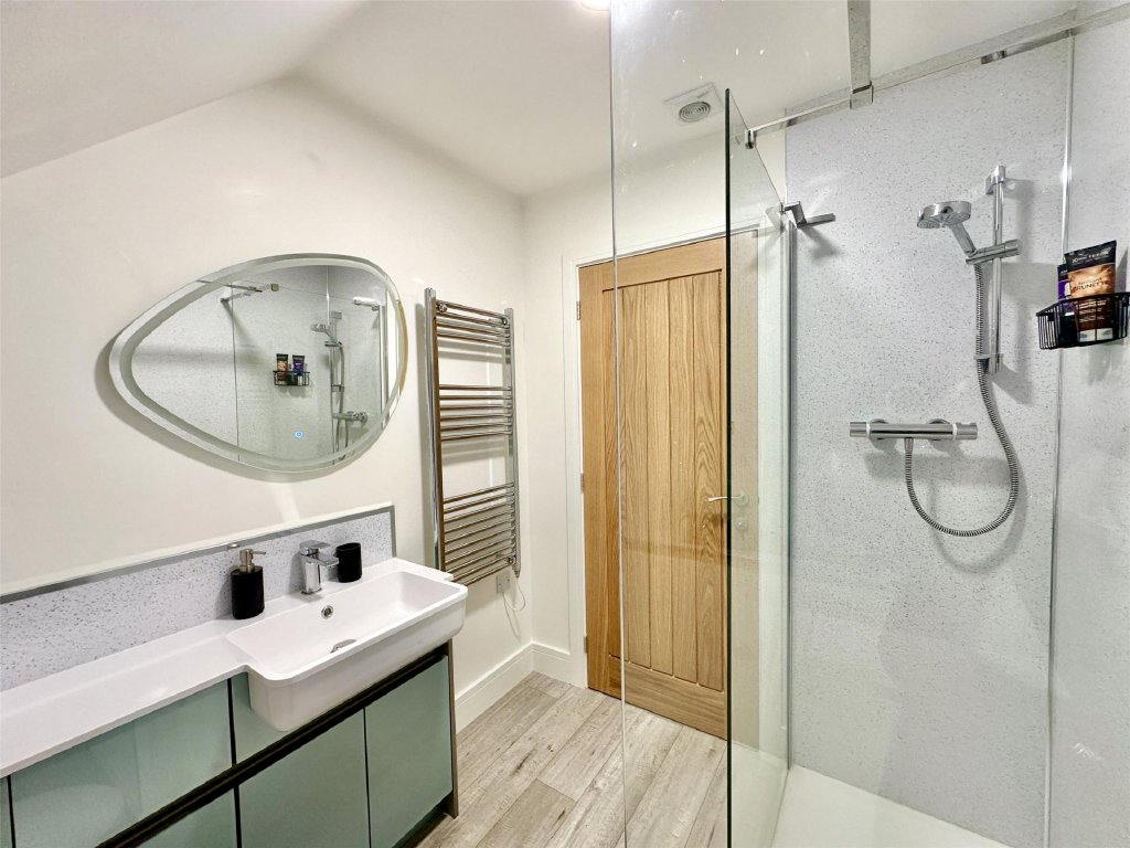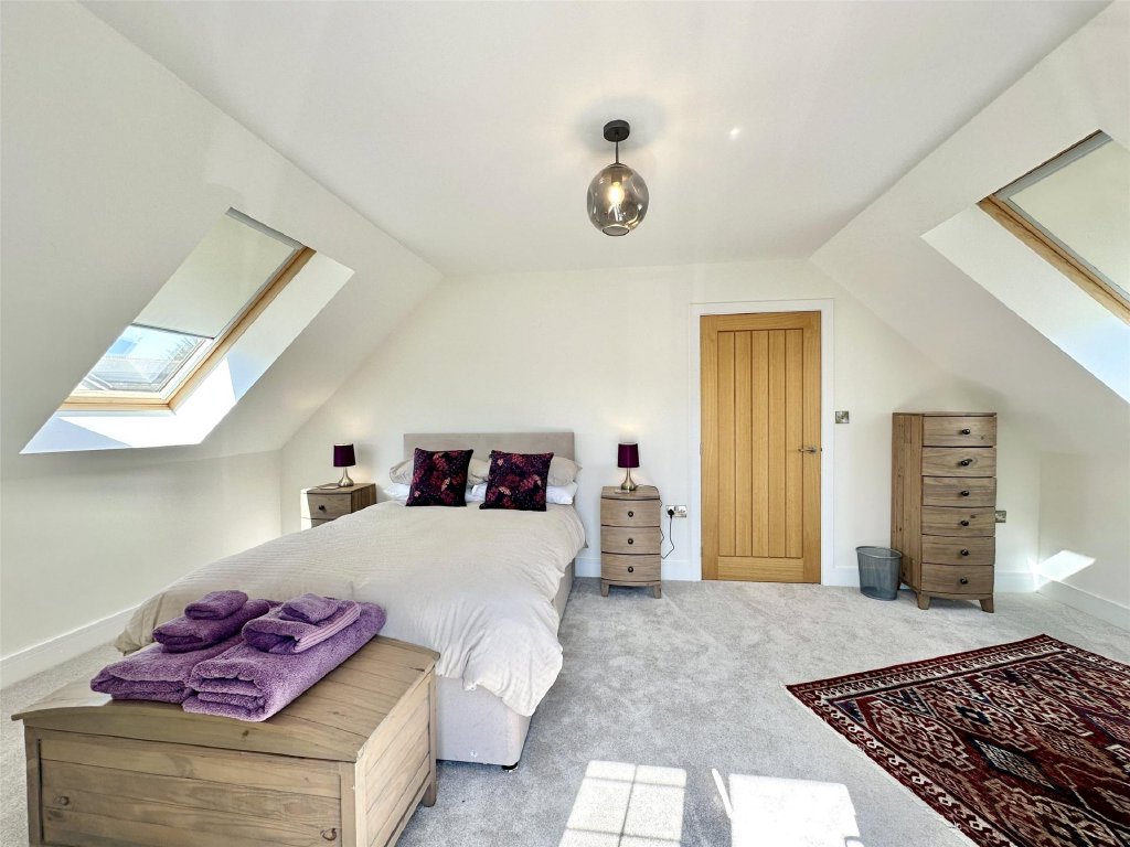 The detached annexe building sits at the bottom of the drive. The ground floor is a further spacious double garage and workshop providing yet more parking, storage or hobbyist’s studio retreat. Sitting above the garage are the additional ancillary annexe rooms which have their own private entrance from the rear of the building. Leading from one of the annexe bedrooms is a charming sunny raised balcony which overlooks the colourful front garden and provides a private outdoor area for the annexe residents.