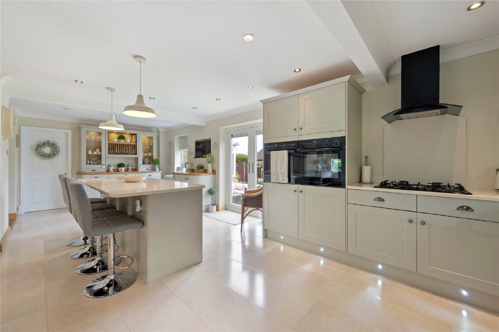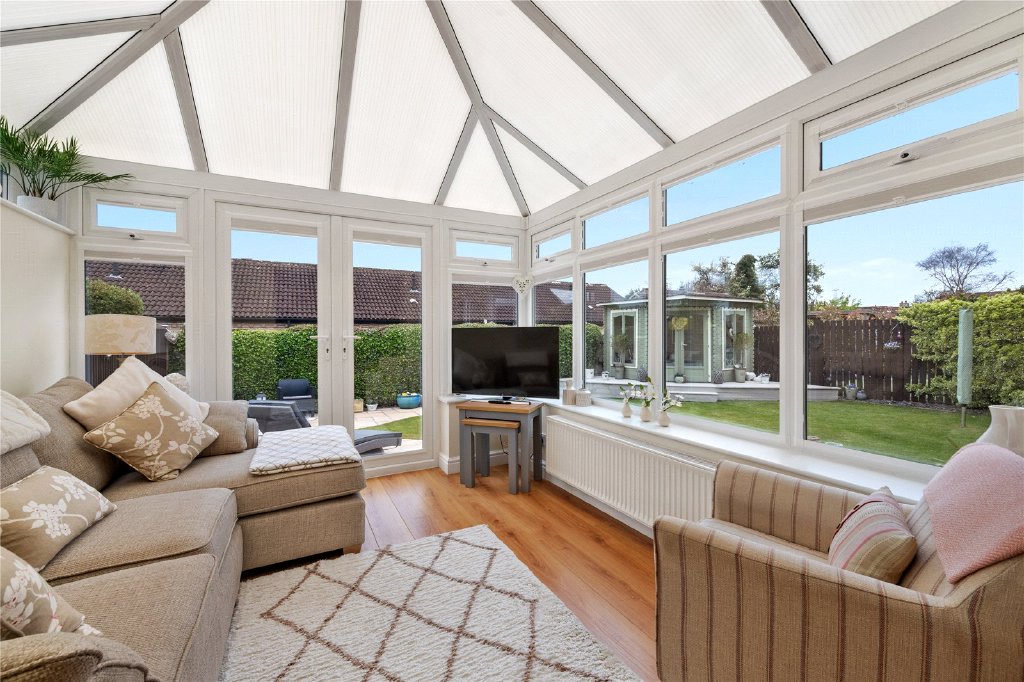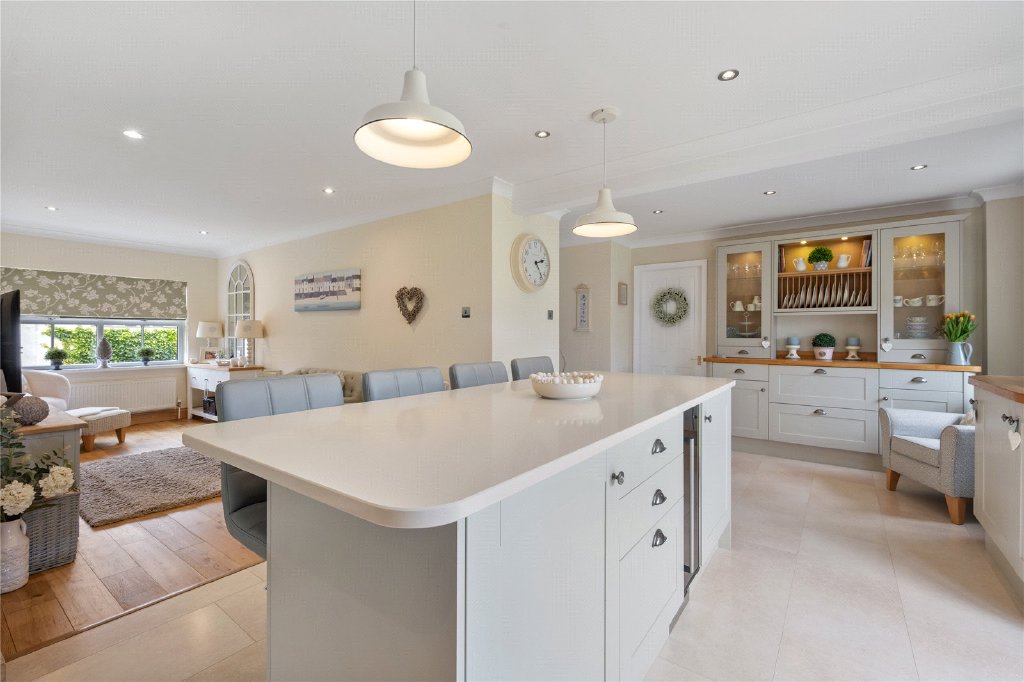 As you step inside this wonderful home, you are welcomed by a spacious entrance hall with a convenient guest W.C. The living room, featuring a charming bay window, offers a calm and inviting space, with direct access through to the formal dining room. At the heart of the home is the stunning open-plan kitchen, complete with built-in appliances, a show-stopping island, underfloor heating, and sleek bi-fold doors that open out to the rear garden—perfect for indoor-outdoor living. Flowing seamlessly from the kitchen is a versatile family room, ideal for entertaining, relaxing, or as a playroom. The formal dining room provides ample space for family gatherings and special occasions and leads into the light-filled conservatory which enjoys air conditioning and peaceful views over the garden.