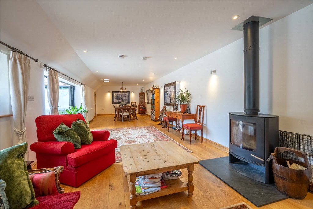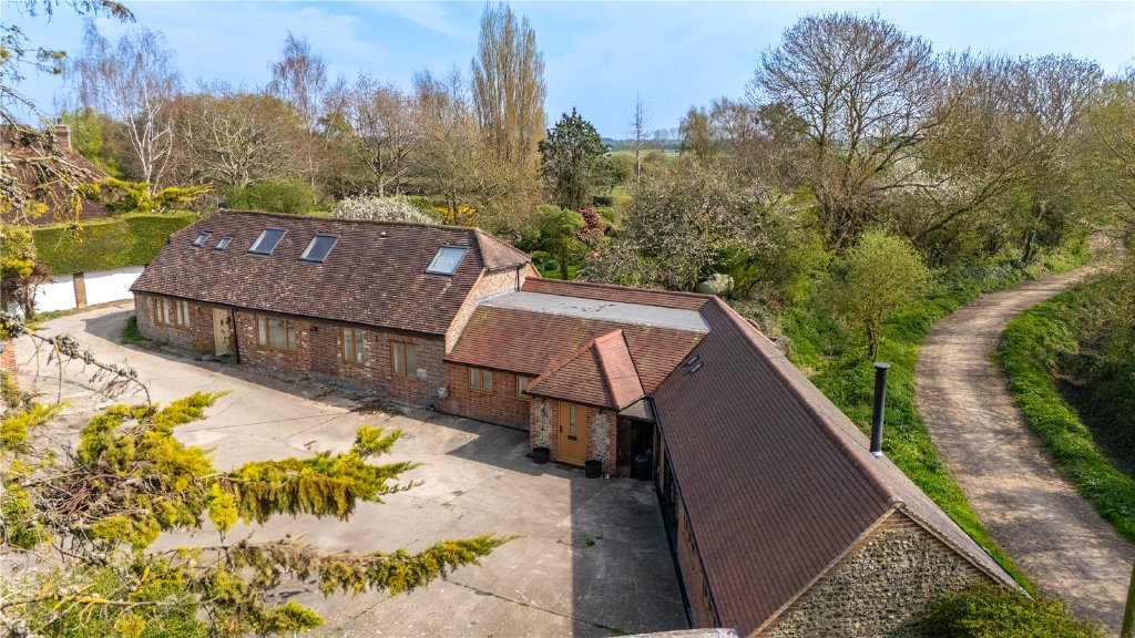 Once part of the prestigious Goodwood Estate, Church Farm Barns is an impressive brick and flint residence that has been beautifully converted from a former farm building into a home of exceptional character and versatility. Thoughtfully designed to retain its historic charm, the property features vaulted ceilings, exposed beams, and rustic brickwork, blending period elegance with modern comfort.