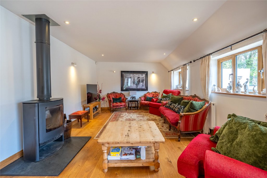 A highlight of the home is the Bull Room, a remarkable reception space converted from a former milking parlour. This spacious area has solid wooden floors, a wood-burning stove, and sliding doors opening onto the courtyard, making it ideal for gatherings and special occasions.