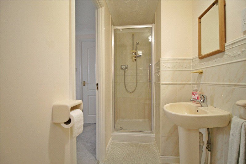 With frosted UPVC window to the side aspect, comprising a three-piece suite, low level WC, wash hand basin and shower cubicle with shower over, tiled splash backs, extractor fan and shaver point.