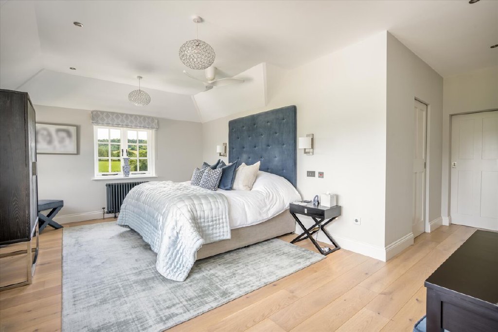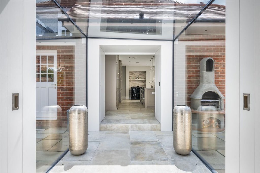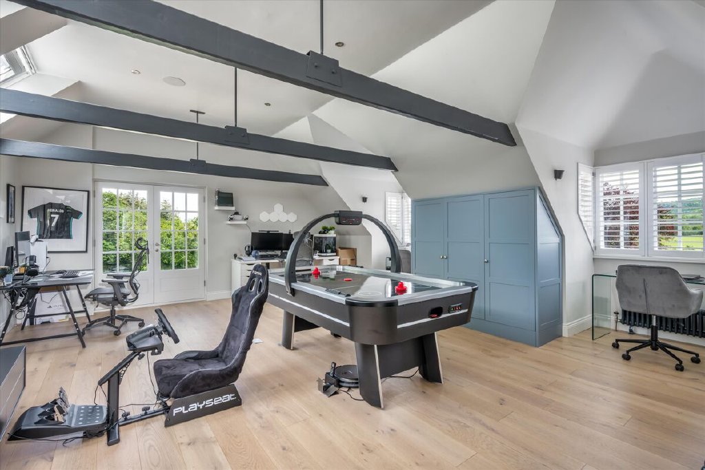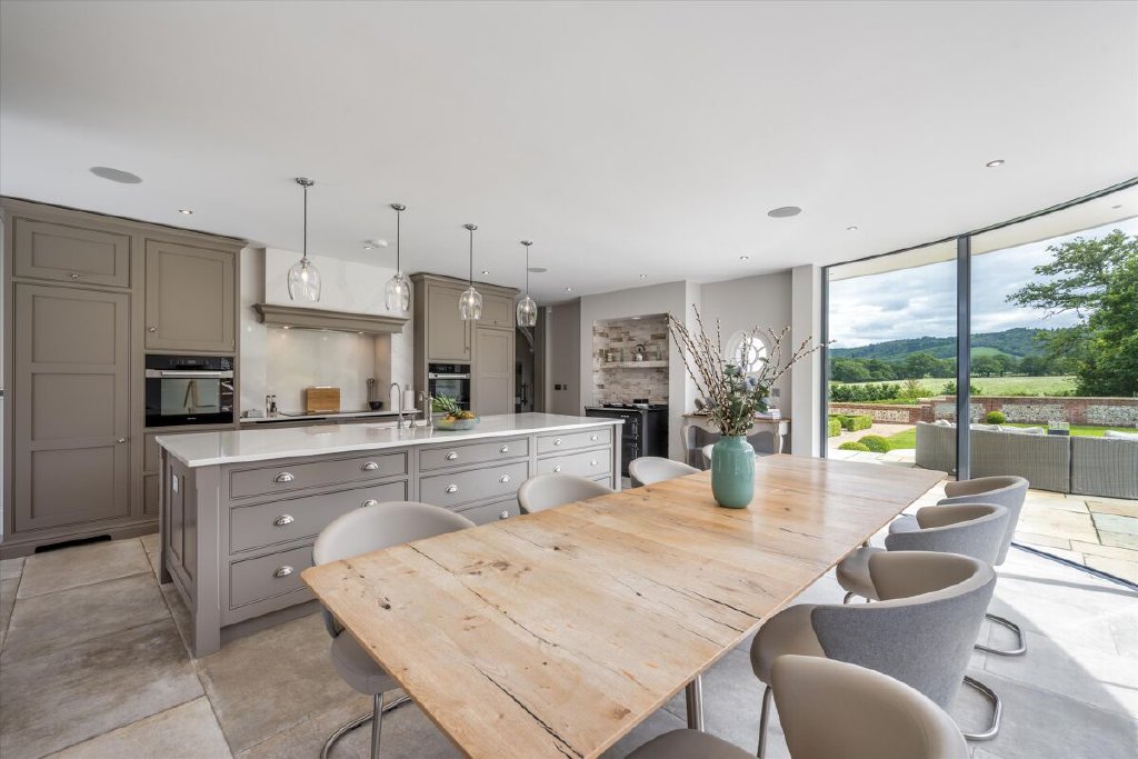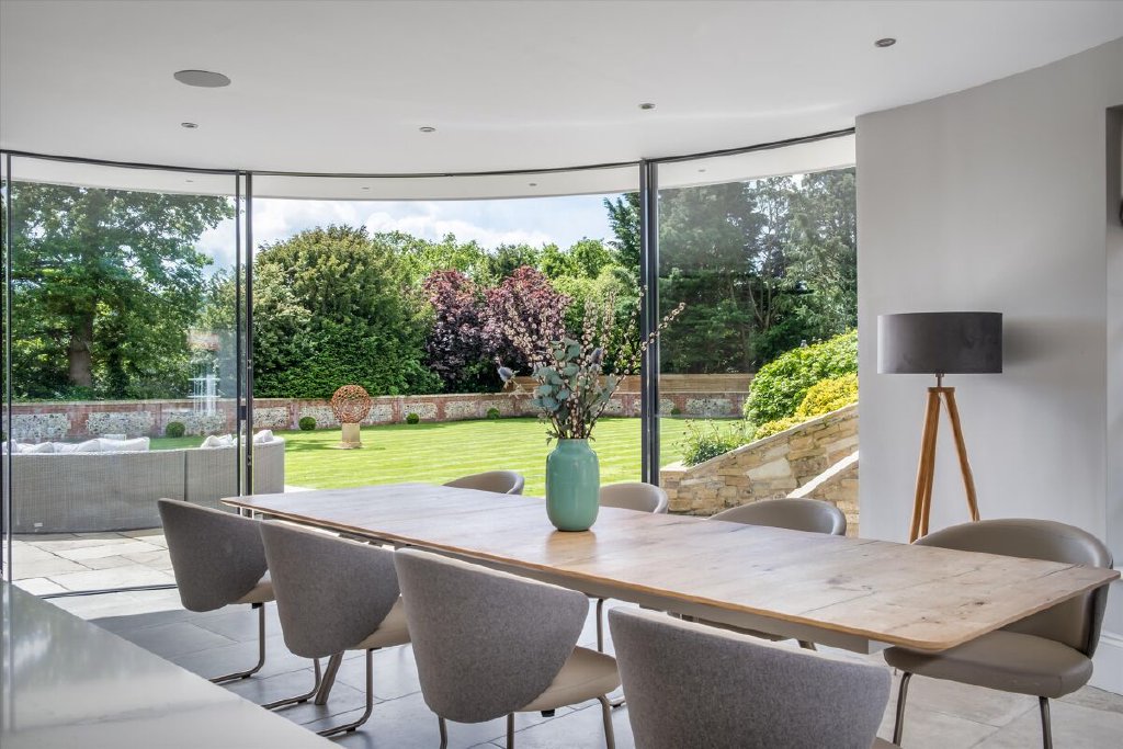 A serious entertaining house, North End has been fully refurbished and modernised back to bare-brick specification in 2022 during our client’s ownership, incorporating many of the old outbuildings seamlessly into the main house and resulting in the perfect modern country house, fit for the next century and beyond. The kitchen/breakfast room to the western elevation is of particular note and features stunning curved, glazed sliding doors by Sky-Frame, an internationally renowned Swiss glazing company, providing stunning views over the formal gardens and southwest towards the Downs. Leading directly from the kitchen/breakfast room via an ingenious glazed link (also by Sky-Frame) are the family room and cinema rooms. The kitchen as well as these two rooms benefit from wet underfloor heating and together form the social and entertaining hub of the house. To the remainder of the ground floor North End offers flexible accommodation with an abundance of unique reception spaces incorporating the formal drawing and dining rooms as well as a gymnasium, music room, separate study and teenage games room.