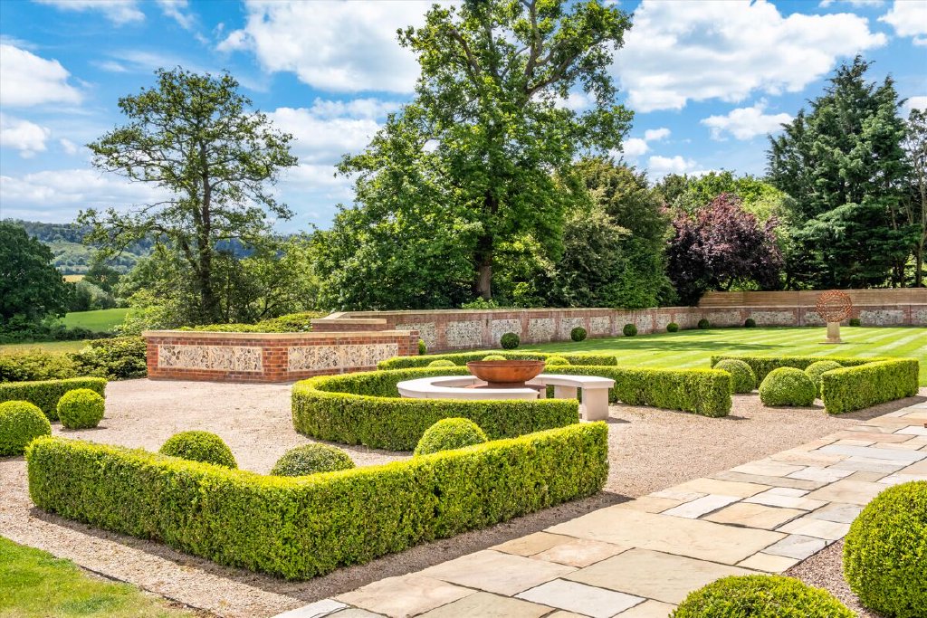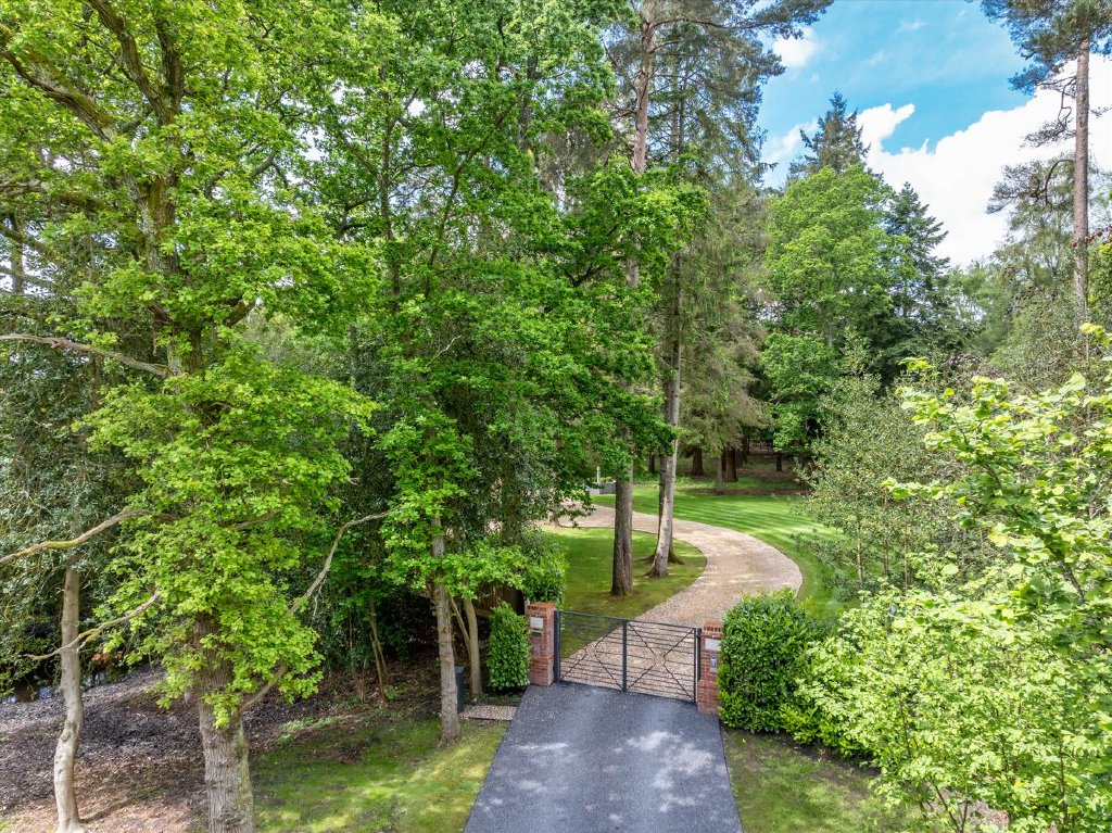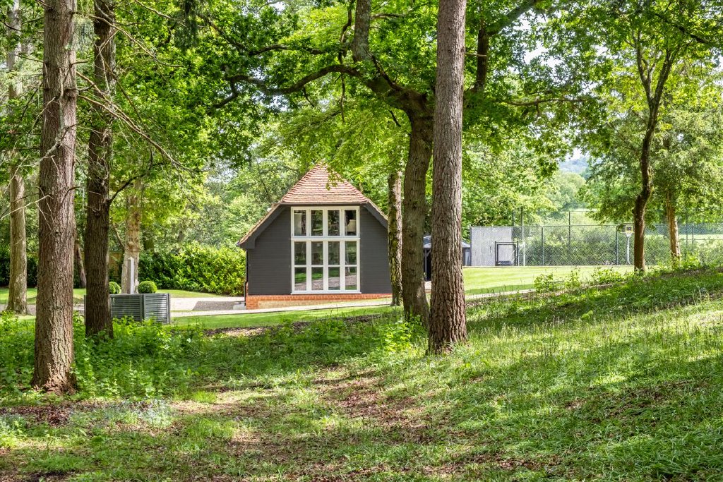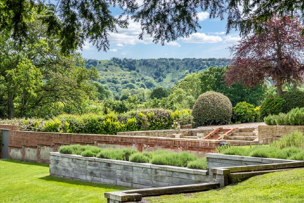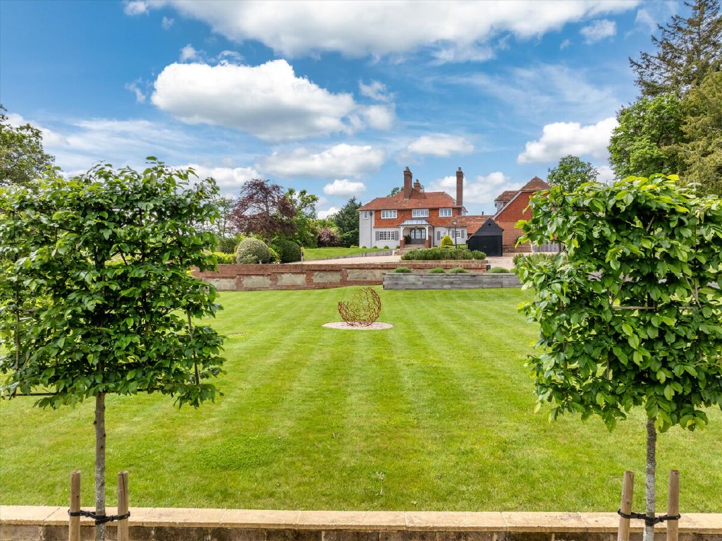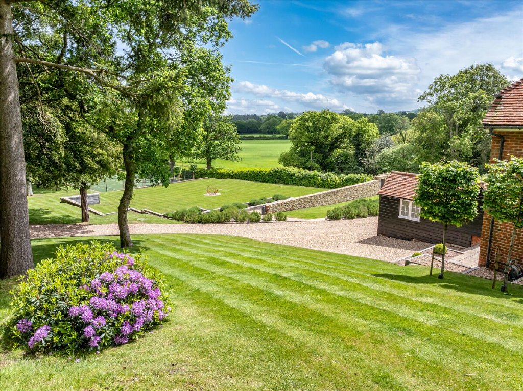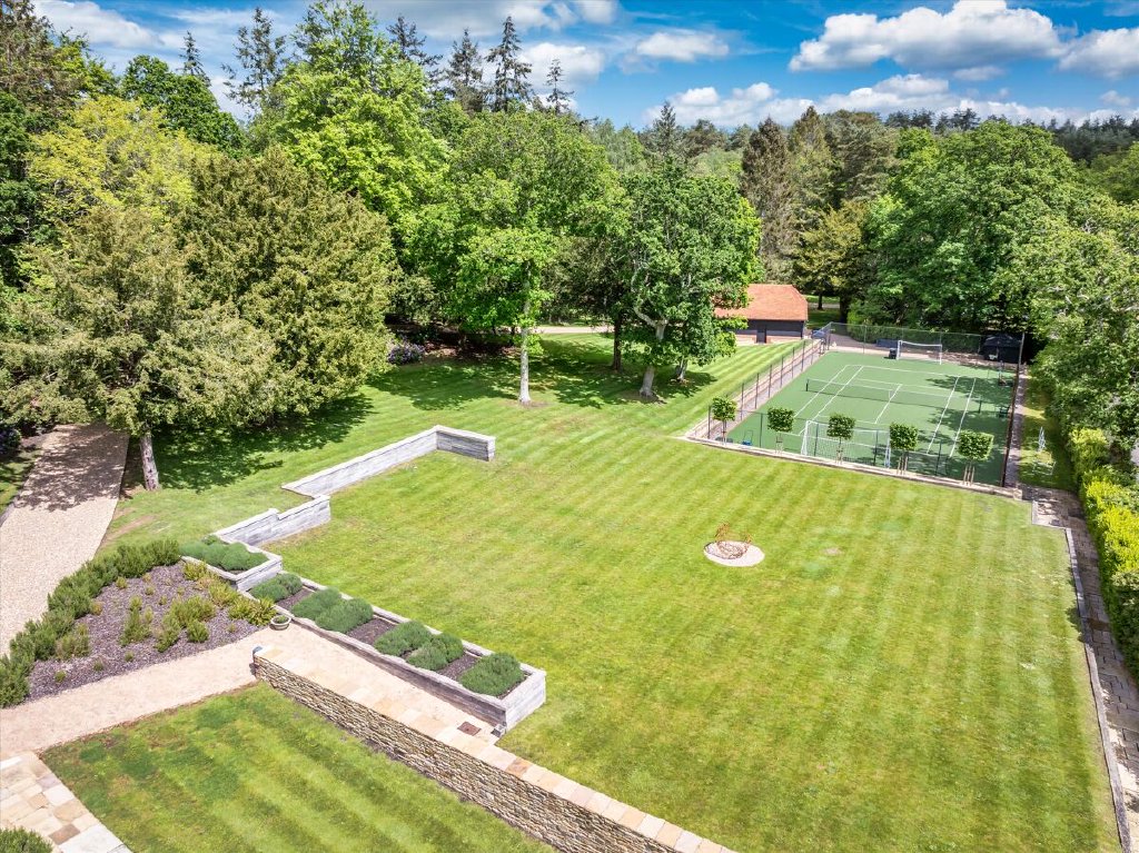 North End is accessed via electric gates, with an impressive gravel driveway winding through the woodland to the front of the house. The gardens and grounds immediately surrounding the house are fully irrigated and mainly laid to lawn with established shrub borders and planted terracing. This terracing, leading directly off the croquet lawn, leads up to the swimming pool; a wonderful space for entertaining during the summer months and with uninterrupted views south over the surrounding countryside. The remainder of the grounds feature well-tended deciduous woodland as well as an astroturf tennis court and guest barn/showroom garage.