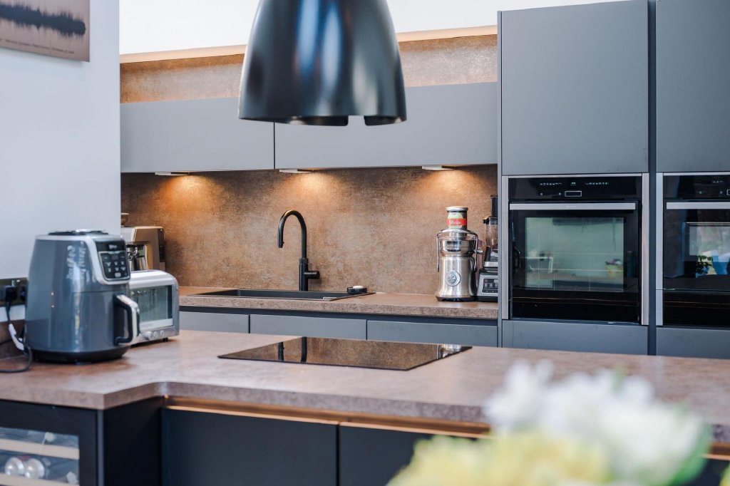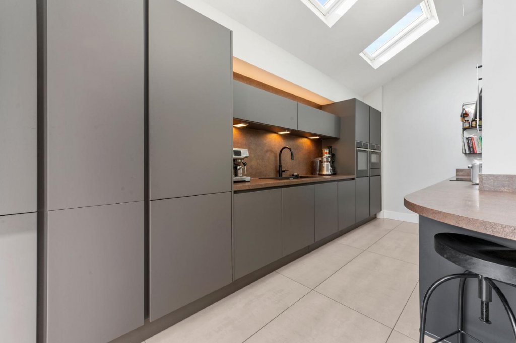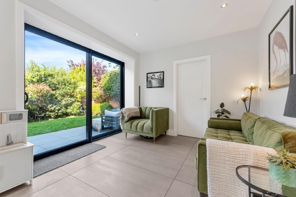 At the rear lies the true heart of the home: an exceptional open-plan kitchen and lounge. The kitchen is a real showpiece, featuring floor-to-ceiling bespoke cabinetry, top-of-the-range integrated appliances, expansive work surfaces, and a refined breakfast bar—perfect for informal dining and entertaining. Sunlight pours in through large rear windows, illuminating every aspect of this sociable space. A conveniently placed utility/WC off the kitchen keeps daily tasks streamlined and discreet.