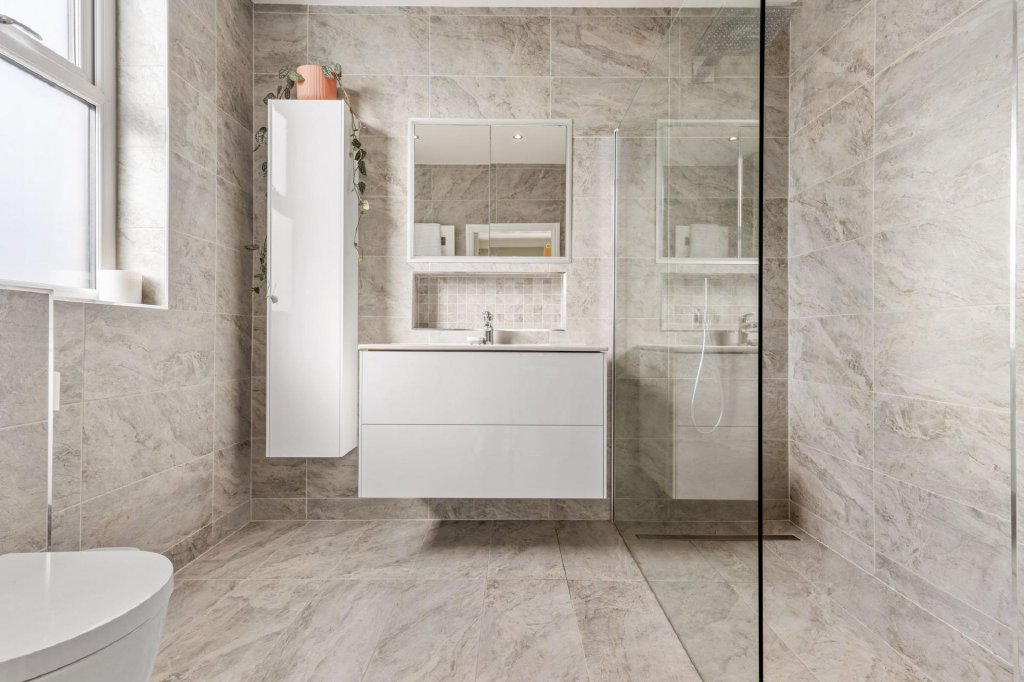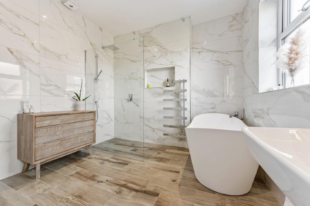 The family bathroom mirrors the luxury of the ensuite, showcasing a contemporary four-piece suite: a deep freestanding bath, separate walk-in shower enclosure, a sleek vanity unit, and stylish tiling. This space has been designed to be both functional and indulgent, ensuring every member of the family enjoys their own private sanctuary.