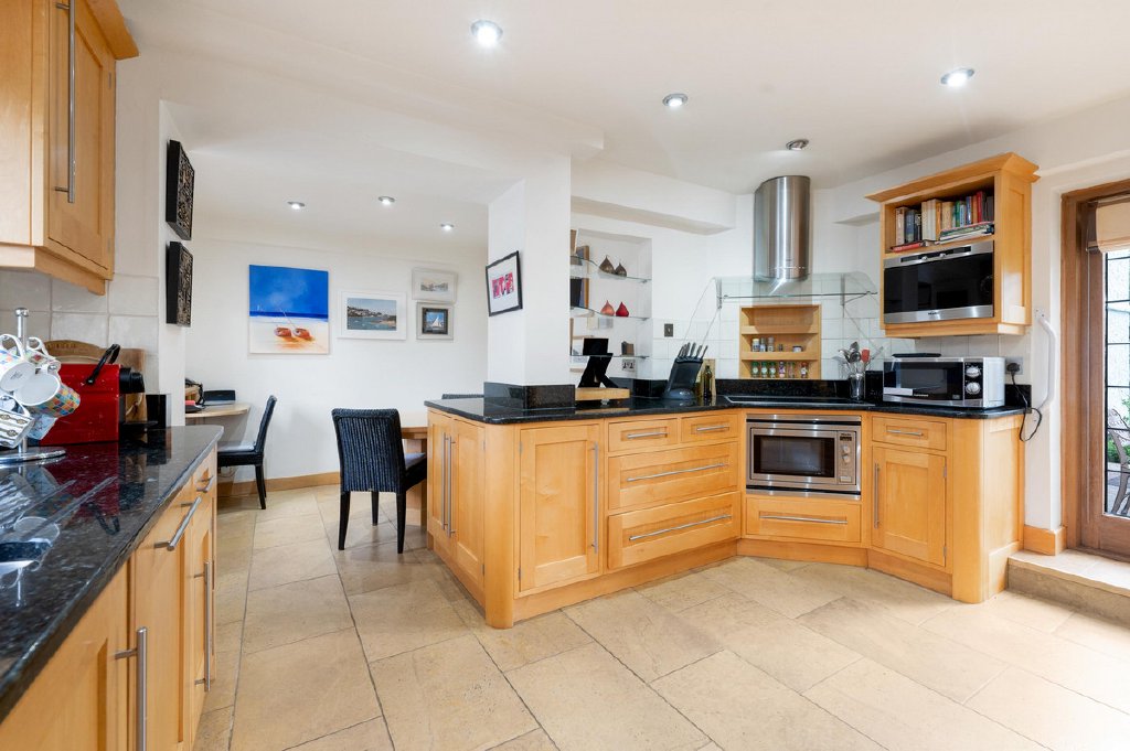 The property is entered through an entrance hall into a central dining room featuring lovely views over the rear garden, a sweeping staircase, and a distinctive corner open fireplace. To one side, a beautifully bright, southwest-facing sitting room includes a large inglenook-style fireplace and leads into a heavily glazed garden room—perfect for enjoying the views in all seasons. Adjacent is a spacious, triple-aspect drawing room, complete with a fireplace and French doors opening onto the garden, creating a superb space for entertaining or relaxing. An inner hallway leads to a cloakroom/WC and a fully bespoke kitchen with a dining area, a range of integrated appliances, and a walk-in pantry. A utility room with an external door and a separate boiler room completes the ground floor accommodation.