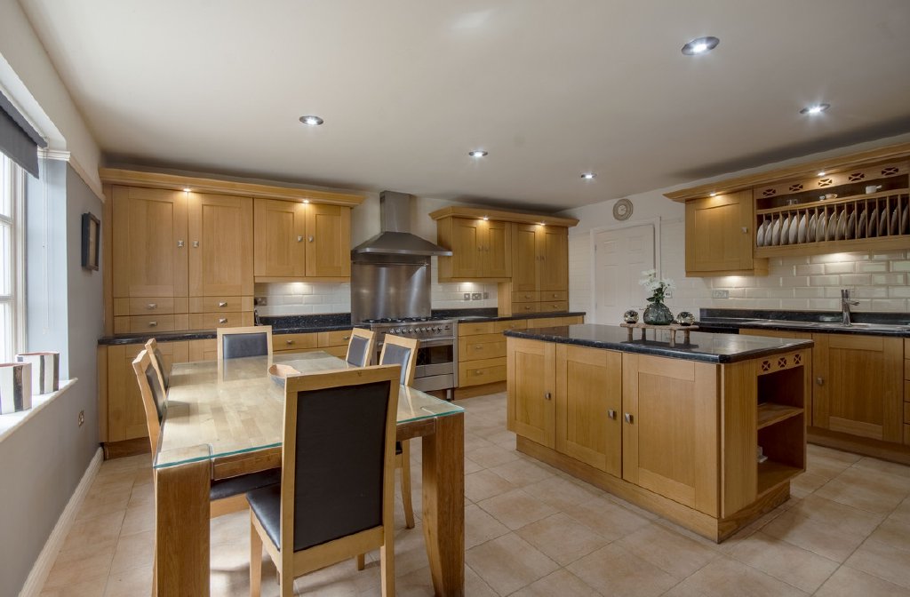 The spacious open plan kitchen diner sits to the front of the property and is fitted with solid oak cabinetry and a central chefs island. Appliances throughout the kitchen include an integral Bosch microwave, dishwasher and a larger Range style cooker with a five burner gas hob and extractor above. There is an opening within the full height units to accommodate a large American style fridge freezer. Other design elements which really enhance the space include aspects such as the plate rack, conveniently positioned above the sink, the open shelving within the island and the wine racks. A door from the kitchen leads into the utility room, which houses further cabinetry in addition to space and plumbing for additional appliances, with a door leading out to the rear garden.