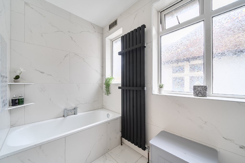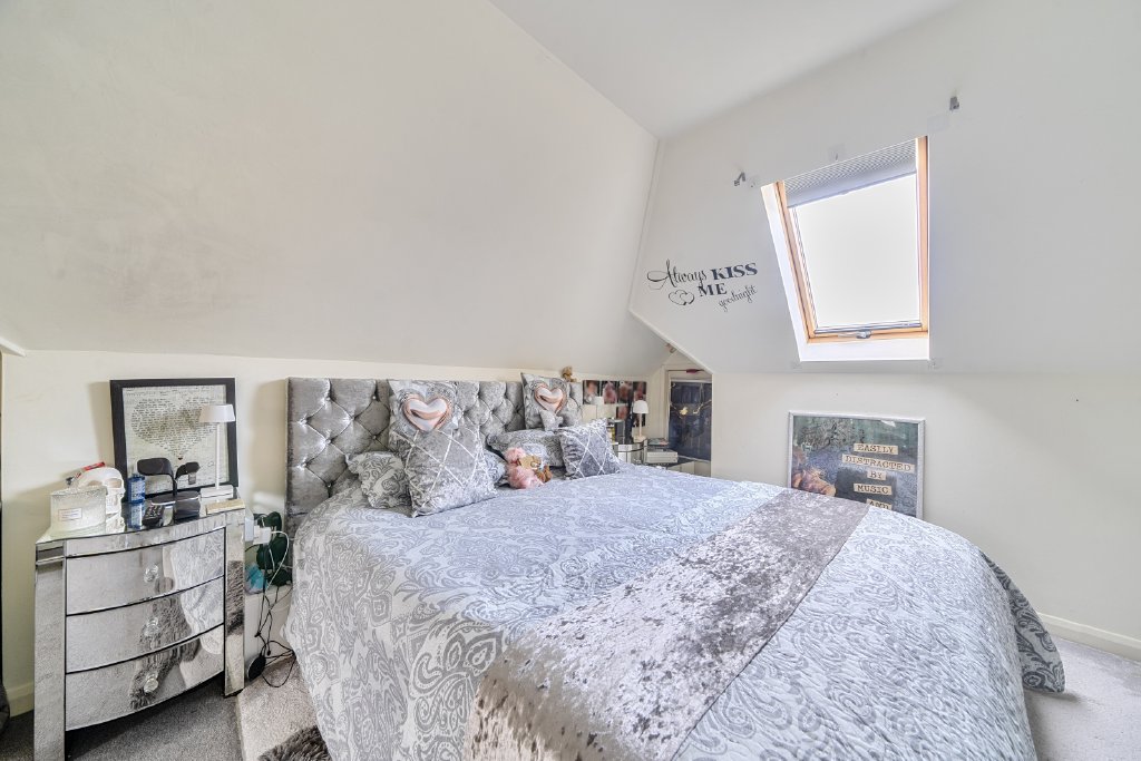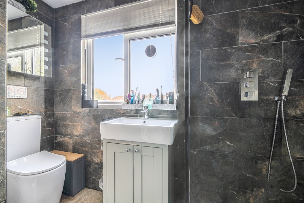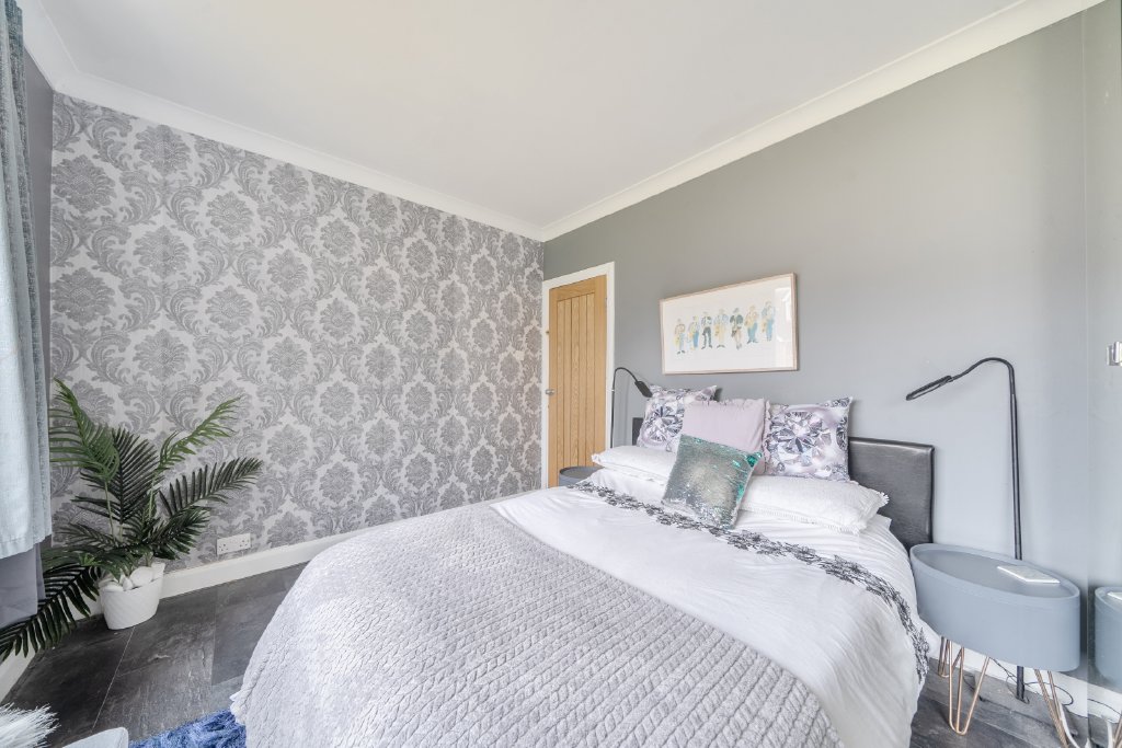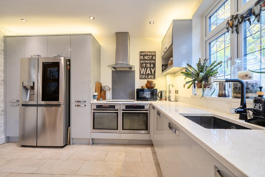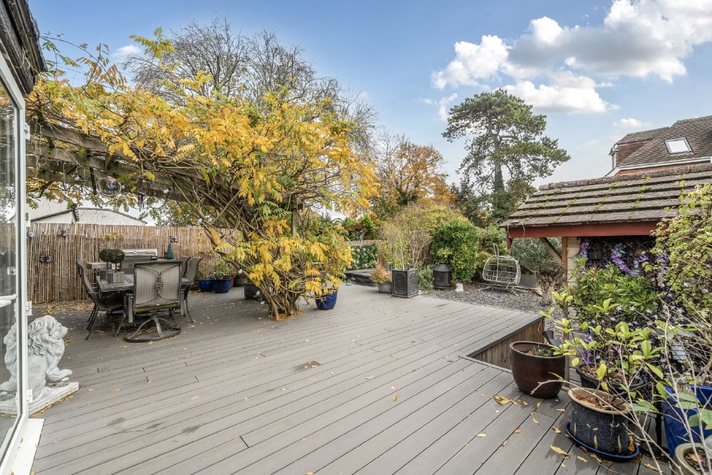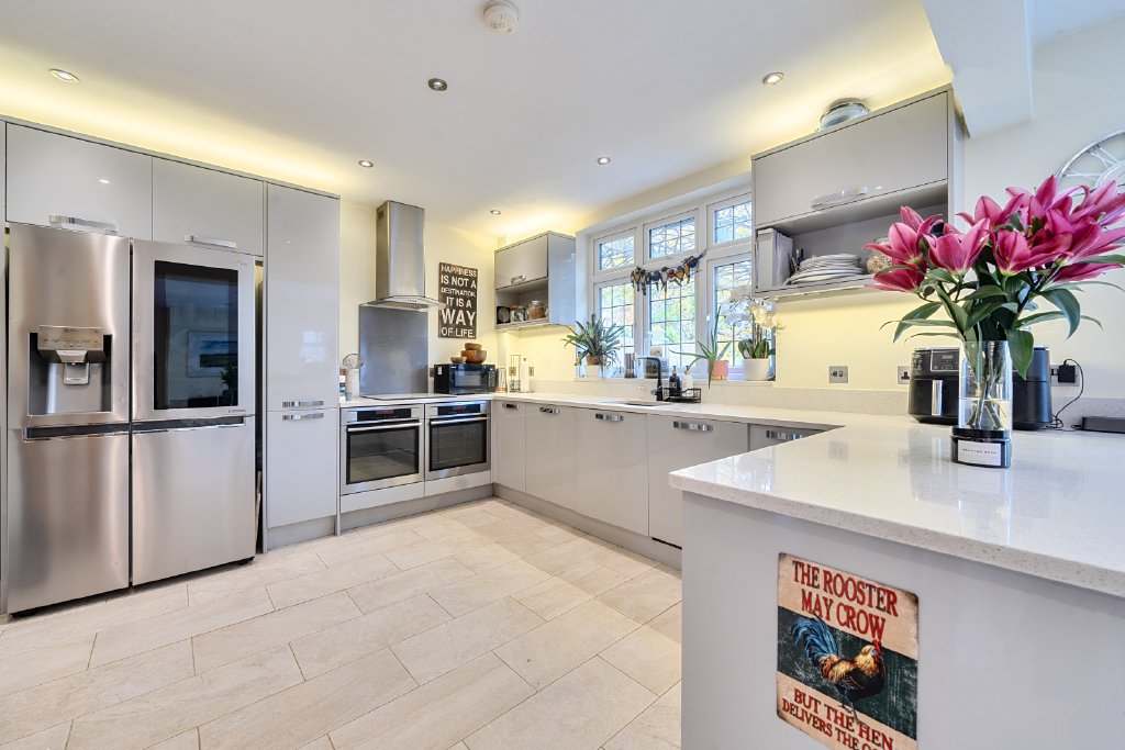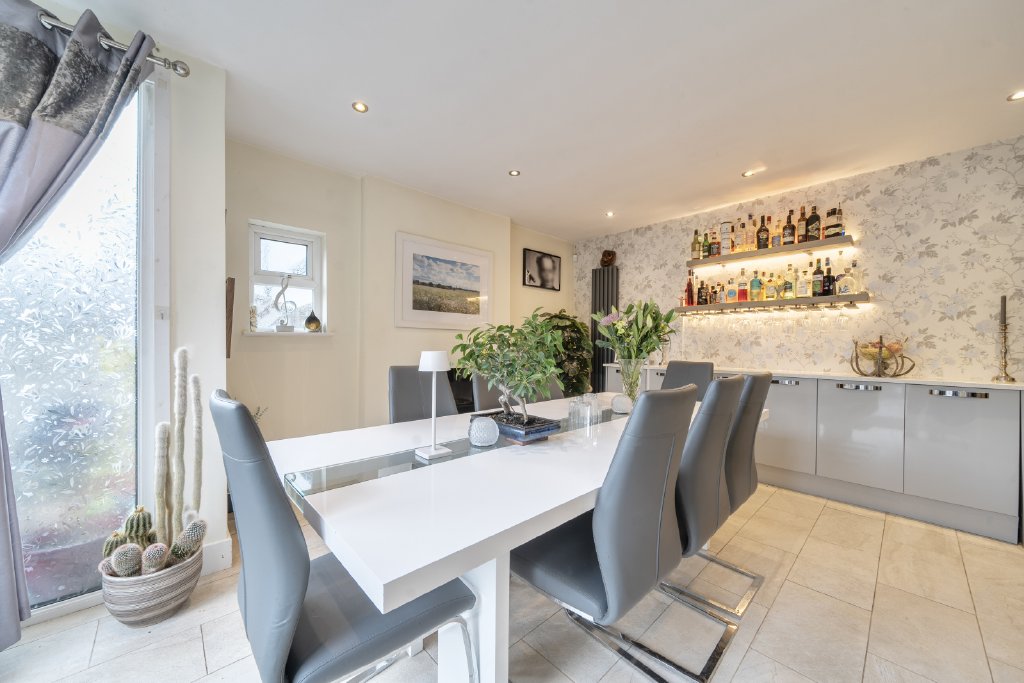 Spanning over 1,800 sq ft, the interior has been thoughtfully designed to suit contemporary family life. On entering the property, through the pretty gabled porch, you are greeted with a light-filled grand entrance hall. The expansive open-plan kitchen and dining area is the heart of the home, opening onto a beautiful south east facing garden boasting a pergola with a fantastic mature wisteria — perfect for alfresco entertaining. An additional reception room with impressive bay window provides ample space for relaxed family living.