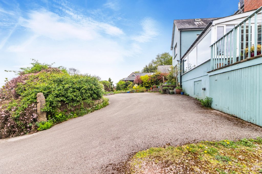 The house lies off a country road, which leads to a large, flat parking area that can accommodate six vehicles. Steps lead from here to the garden to the rear of the property.