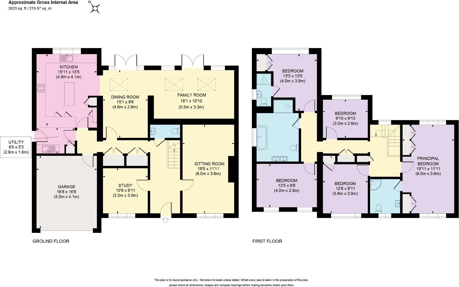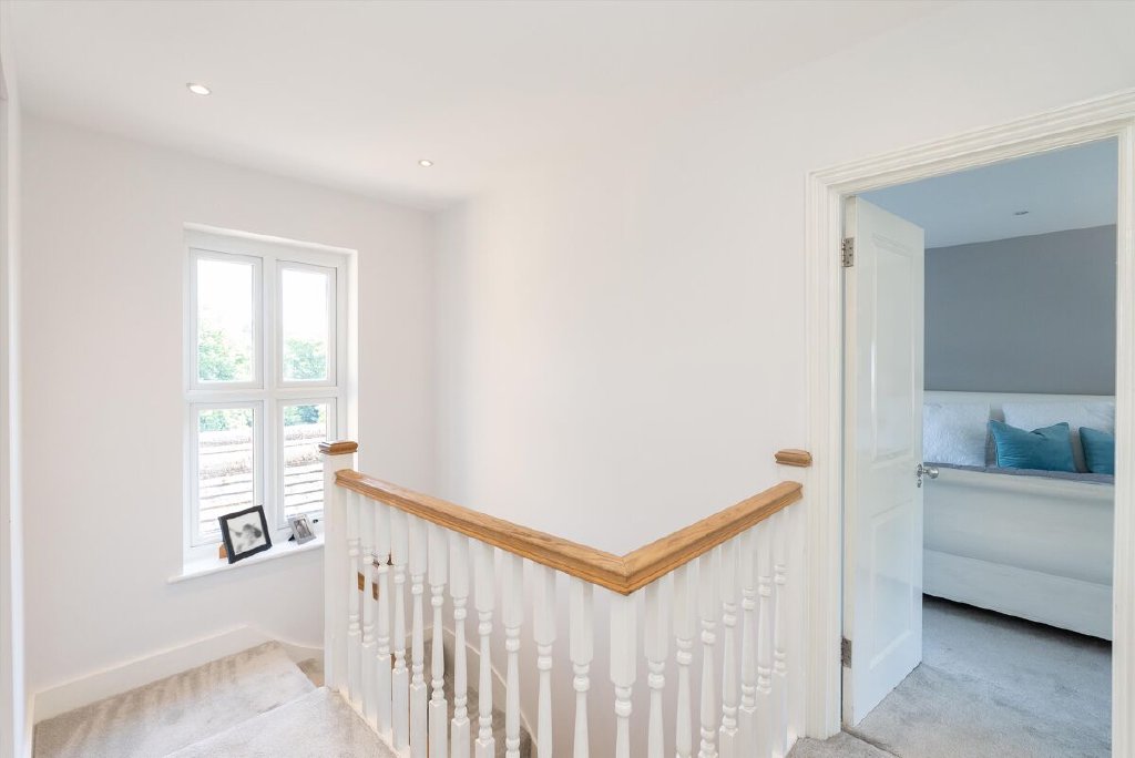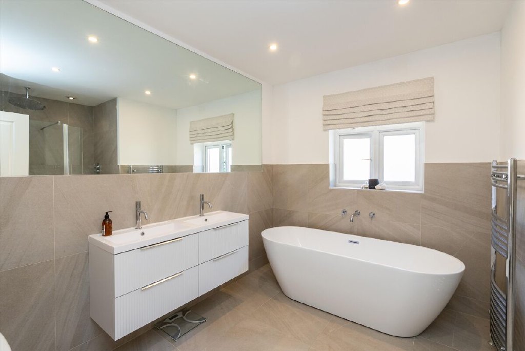 Upstairs, the landing has a window overlooking the rear garden. The principal bedroom enjoys a double aspect, built in wardrobes and a luxury en suite shower room. The guest suite also has fitted cupboards and an en suite shower room. There are three more double bedrooms and a stunning family bathroom with a freestanding bath and separate shower.
