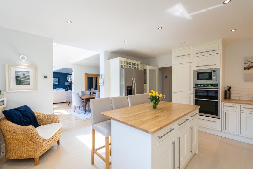 The spacious entrance hall includes a luxury refitted cloakroom with tiled floor. The sitting room has a front-facing view and an attractive feature fireplace. Across the hall, there’s a study which also enjoys views to the front aspect. The hall leads through to a stunning open plan family room, separate dining room and Shaker style kitchen with central island. This exceptional lateral living space enjoys views over the garden with the family and dining areas having direct access to the garden. The kitchen has an excellent range of fitted units with complimenting butchers block work tops, integrated appliances and underfloor heating, plus a separate utility room.