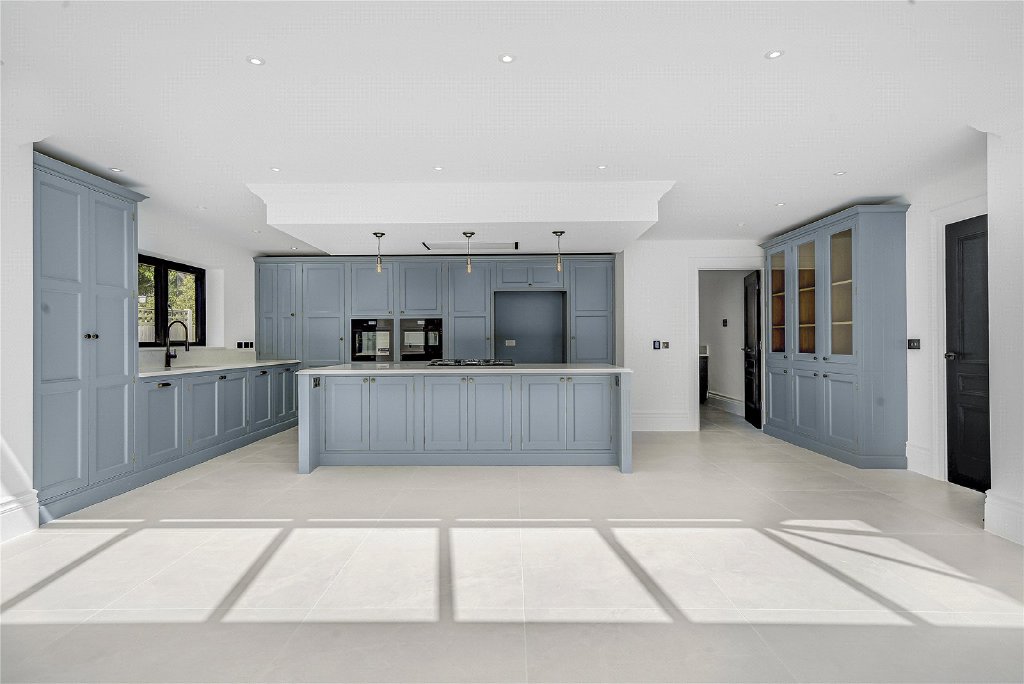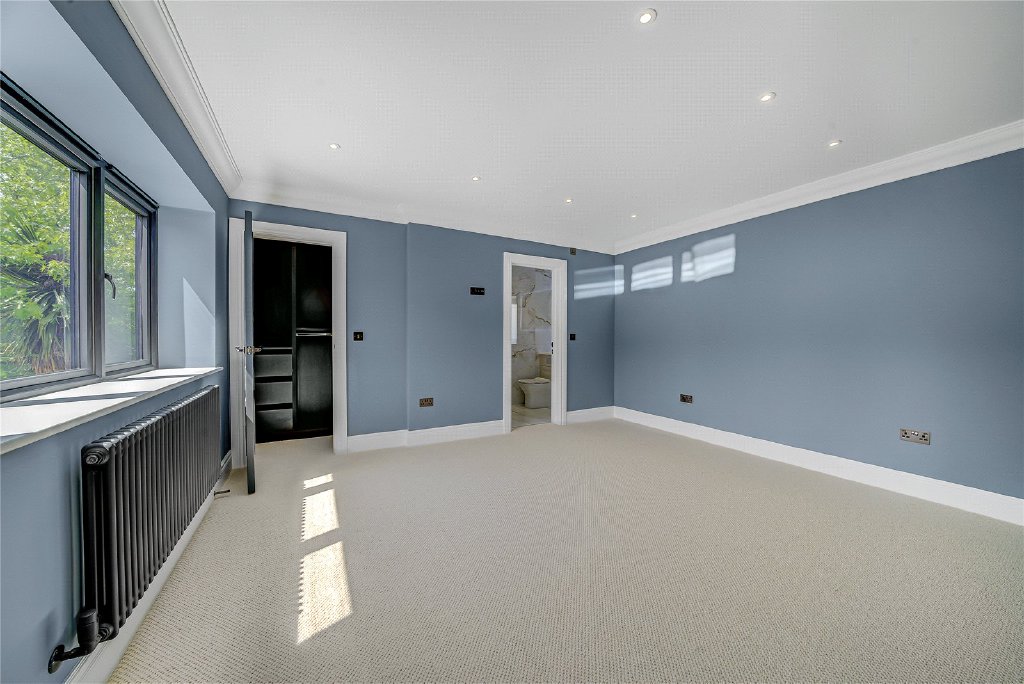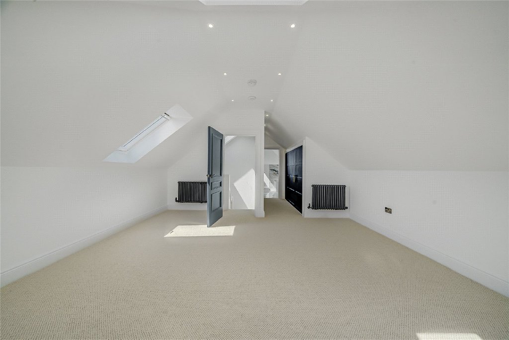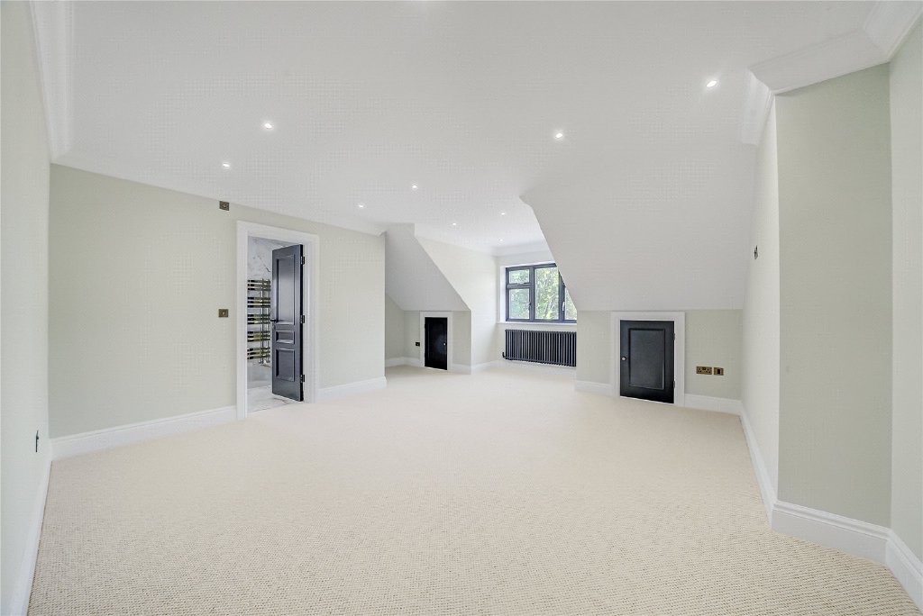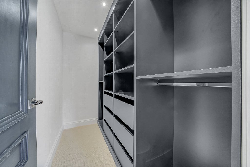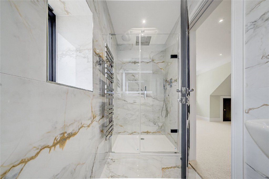 On the second floor, a remarkable fifth en-suite bedroom awaits, complete with extensive bespoke storage, a generous walk-in shower, and a statement freestanding bath, making it the perfect sanc-tuary for guests or older children.