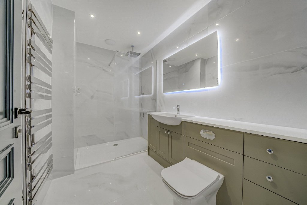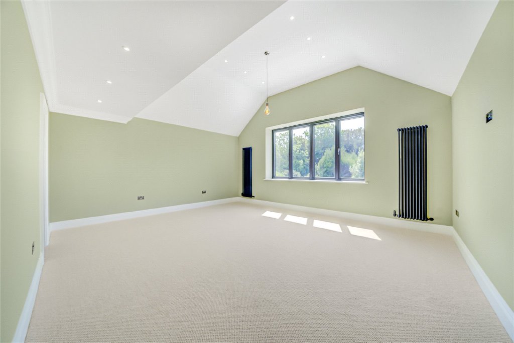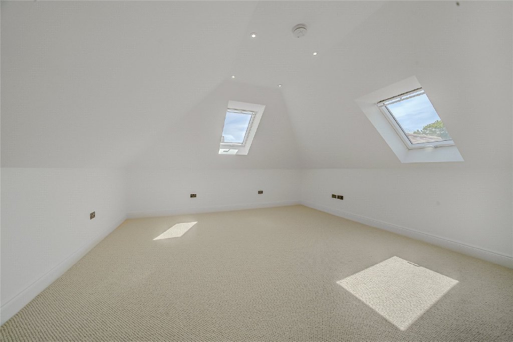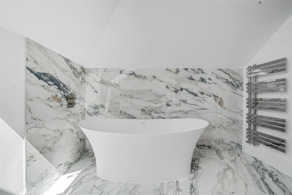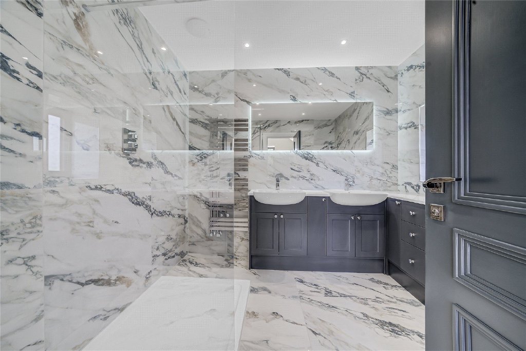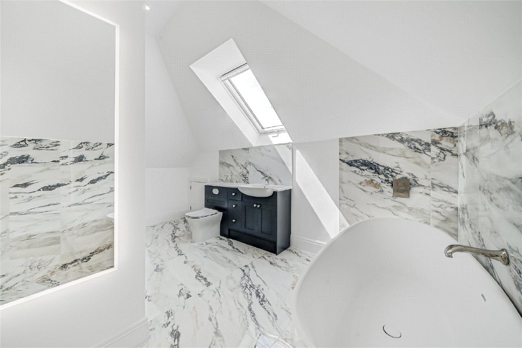On the second floor, a remarkable fifth en-suite bedroom awaits, complete with extensive bespoke storage, a generous walk-in shower, and a statement freestanding bath, making it the perfect sanc-tuary for guests or older children.