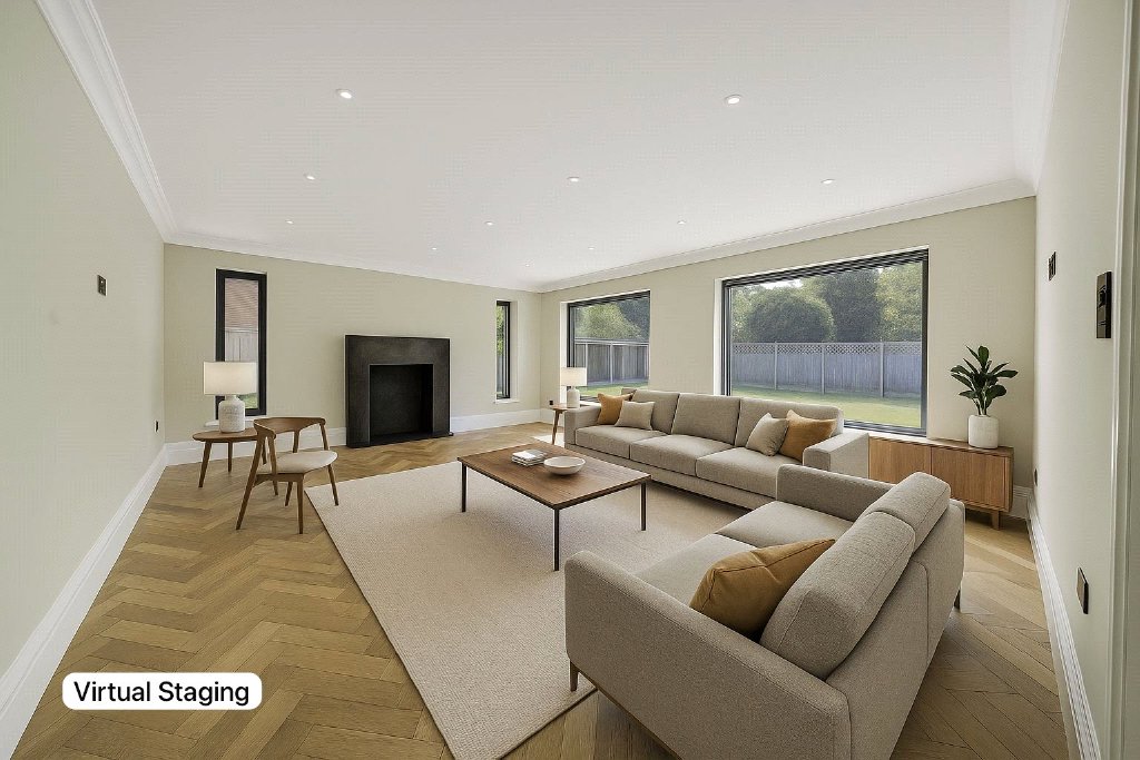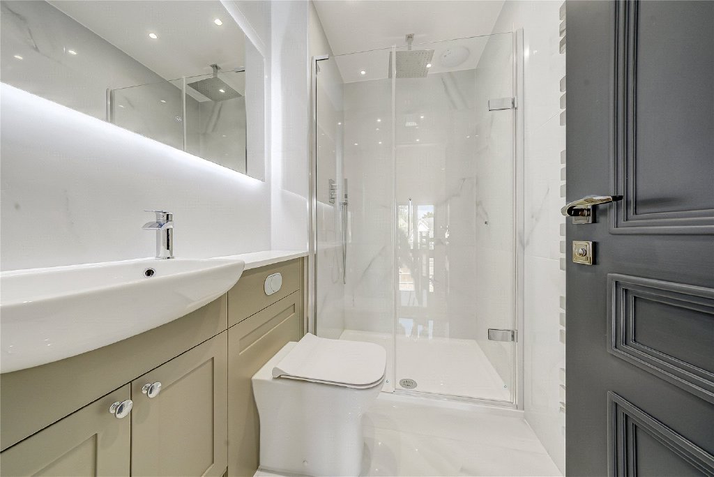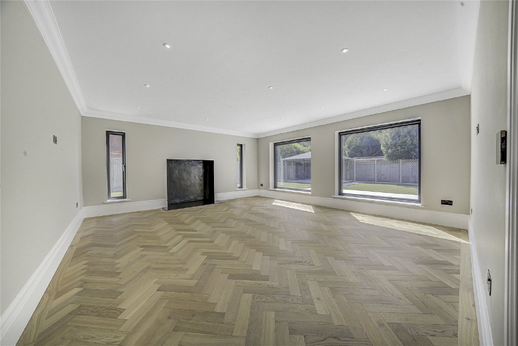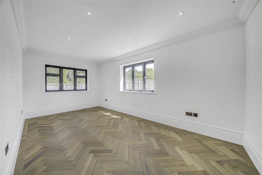 Meanwhile, the living room is both spacious and inviting, with herringbone solid oak flooring and picture windows that frame views of the sun-drenched garden. A versatile study, paired with a sleek ground-floor shower room, provides the option for a guest suite or flexible home office space.