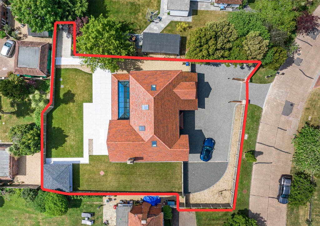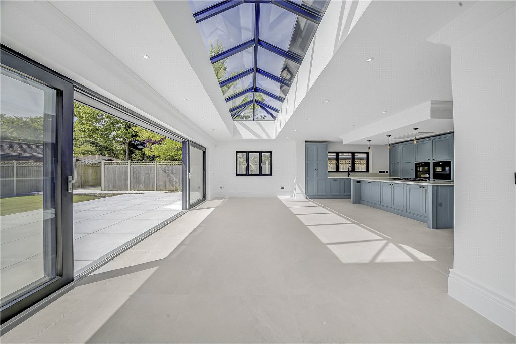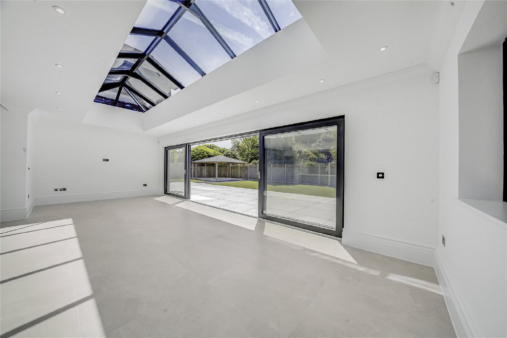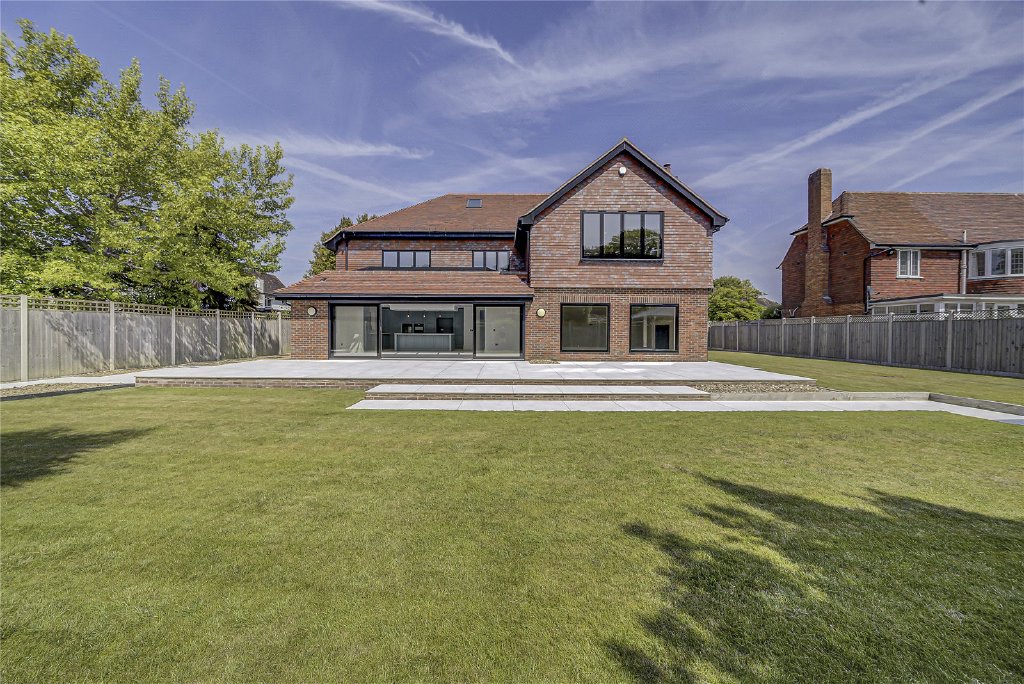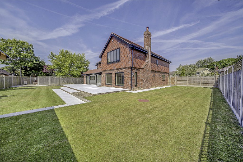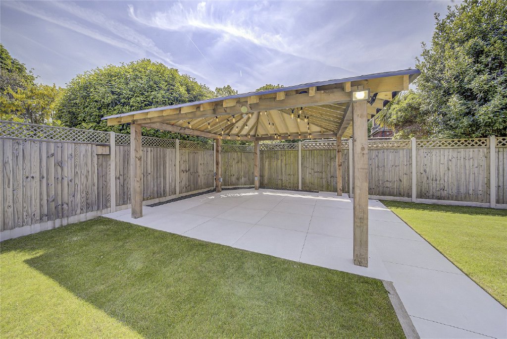 To the rear, a full-width patio offers the ideal space for al fresco dining and entertaining, while a detached covered terrace presents a perfect setting for an outdoor kitchen or lounge area. The rest of the garden is laid to lawn, with a hardstanding area where a letter of consent has been granted for a summer house, the perfect future retreat, studio, or home office.