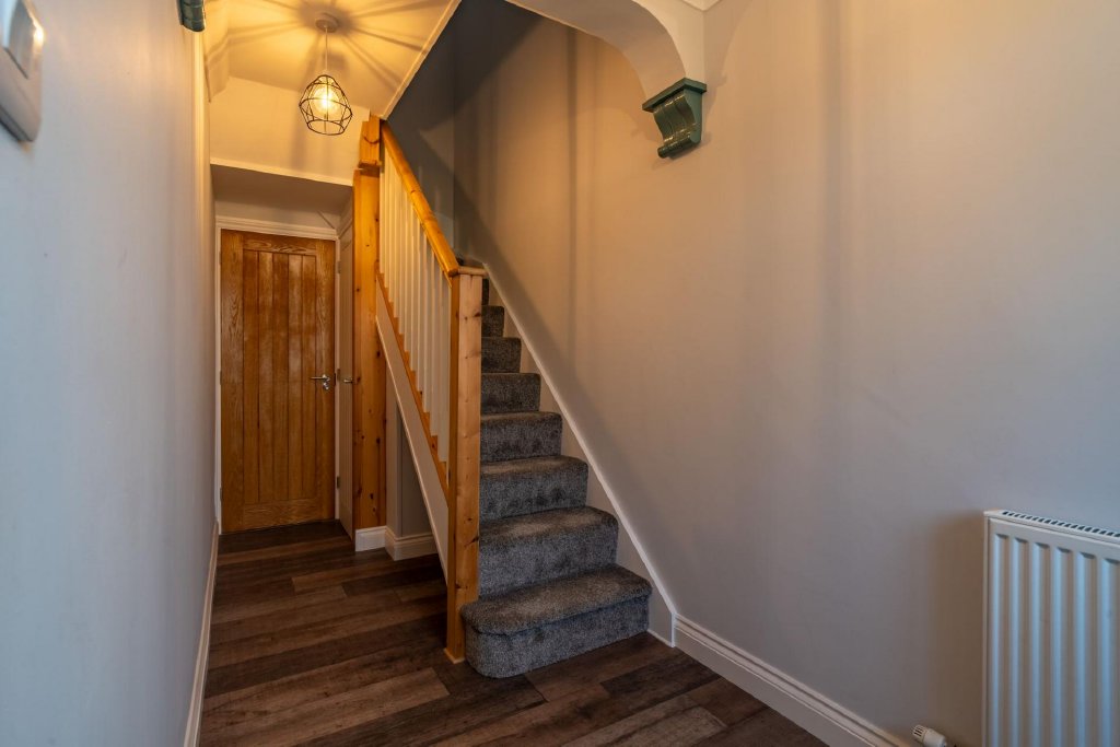 - Bedroom 2 – Rear-aspect, with a large Velux skylight, exposed A-frame, vaulted ceiling, and radiator.