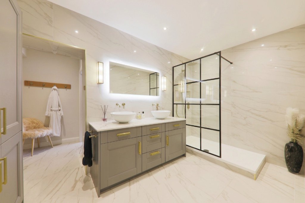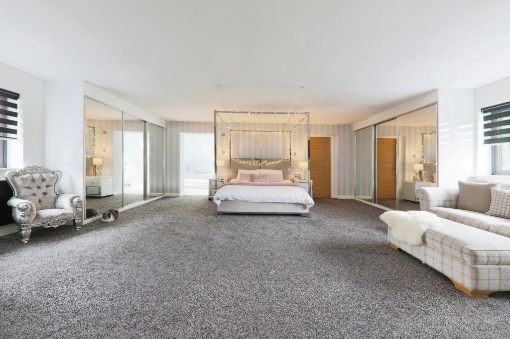Upstairs, the master bedroom measures an impressive 23' x 20' and includes a luxurious en-suite, a large walk-in dressing room, and extensive fitted wardrobes. There are five further bedrooms across the first floor and three additional bathrooms, offering more than enough space for family and visiting guests.