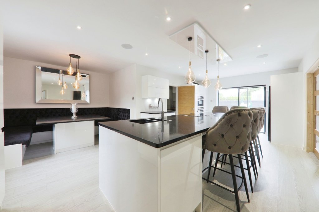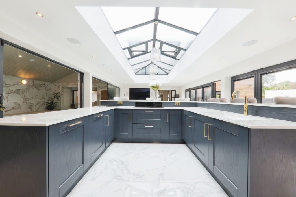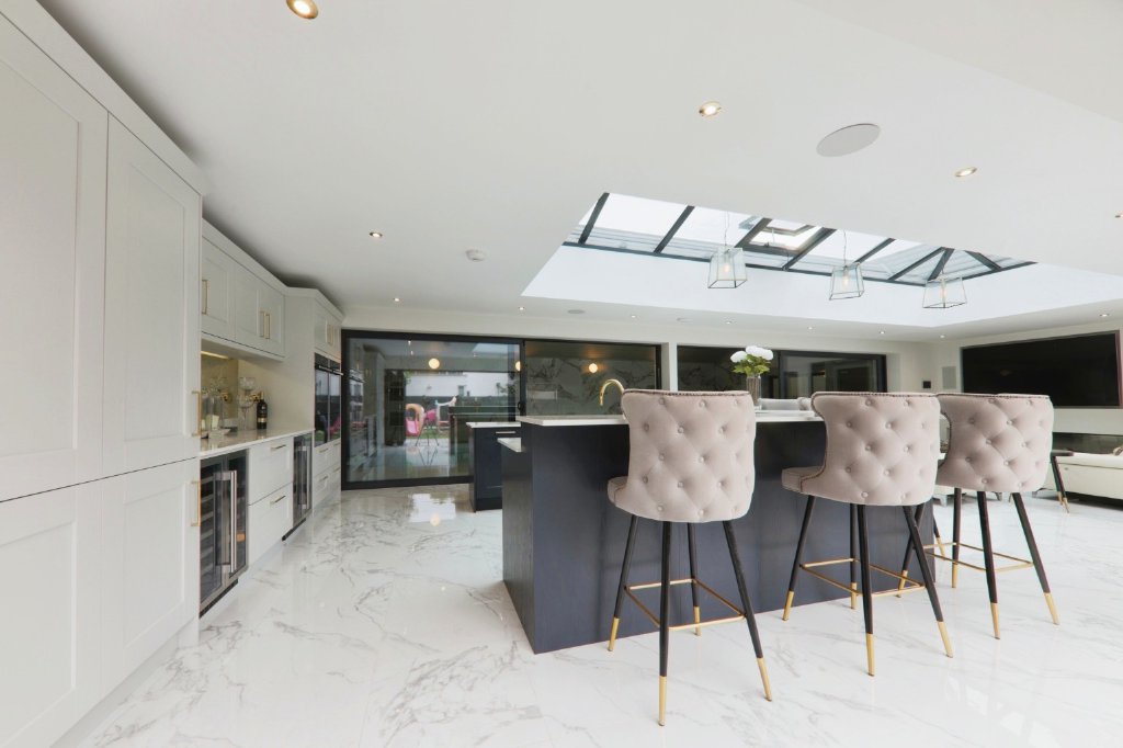 - Orangery Style Living Kitchen With 40 ft Bi Fold Doors And Breakfast Bar For Eight