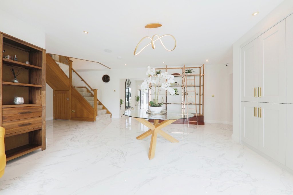 With 5,500 sq. ft. of outstanding accommodation and no expense spared, this impressive home offers a luxury lifestyle from the moment you arrive. It features an indoor heated swimming pool with a children’s splash pool, a stunning orangery-style living kitchen with 40 feet of full-width bi-fold doors, and a high-specification kitchen complete with a breakfast bar for eight and a full suite of integrated appliances.