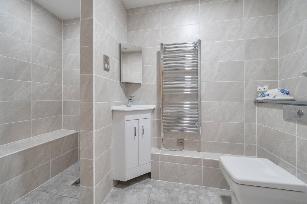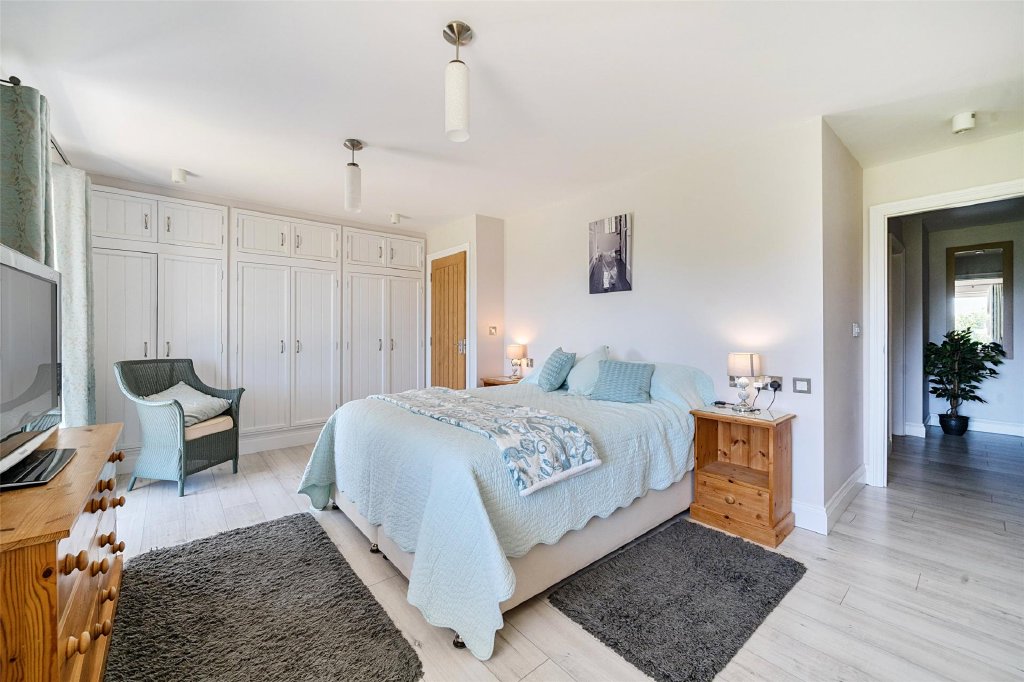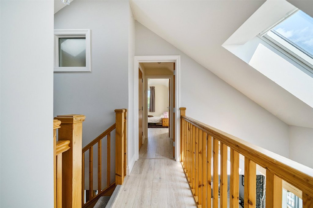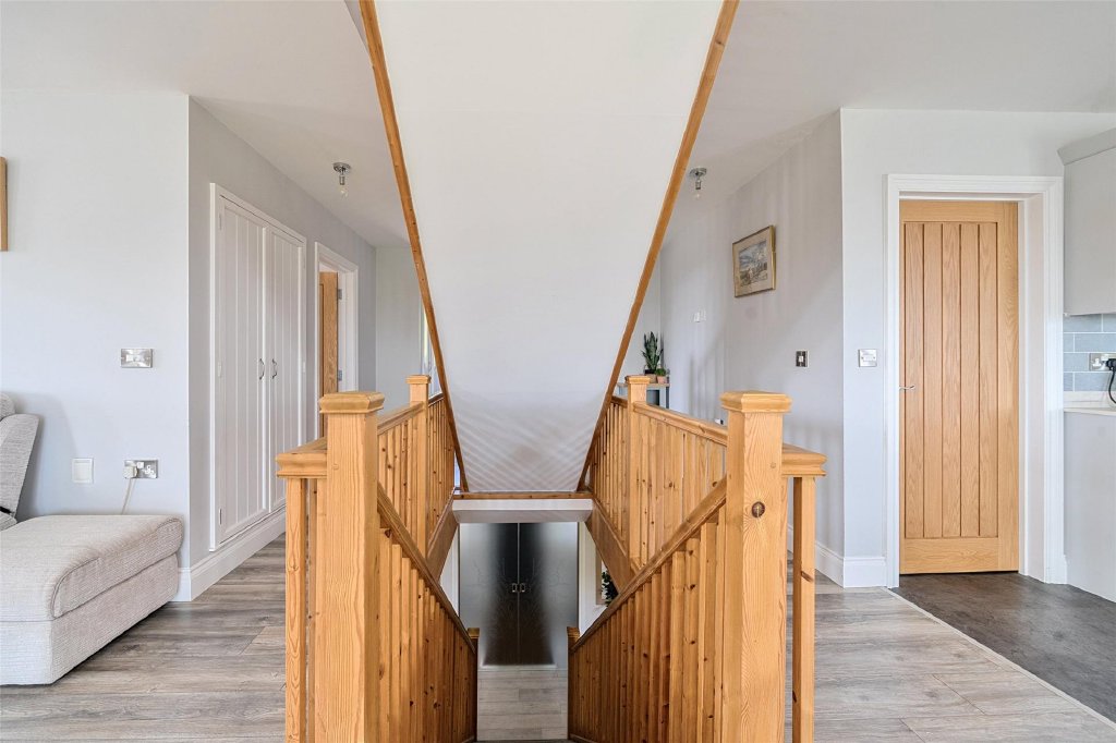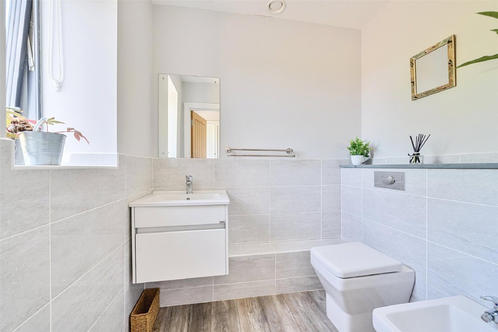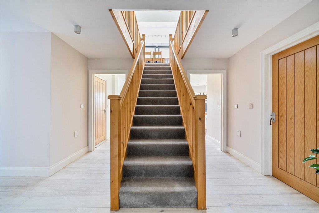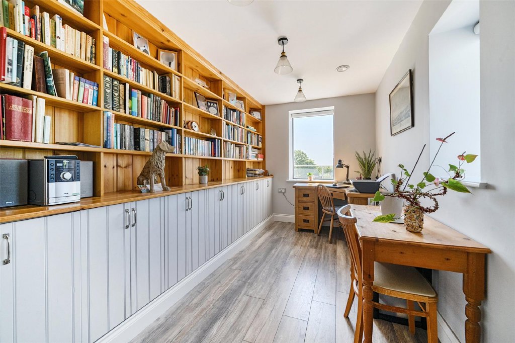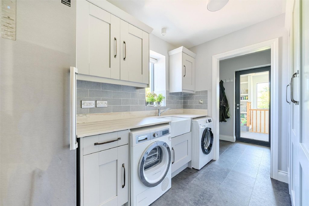 Additional rooms on this floor include a well-appointed office with built-in shelving, a cloakroom/WC, and a utility room finished to the same high standard as the kitchen. The utility comes equipped with a Samsung freezer, Bosch tumble dryer, and Gorenje washing machine. A secondary staircase descends from here to a practical storage room.