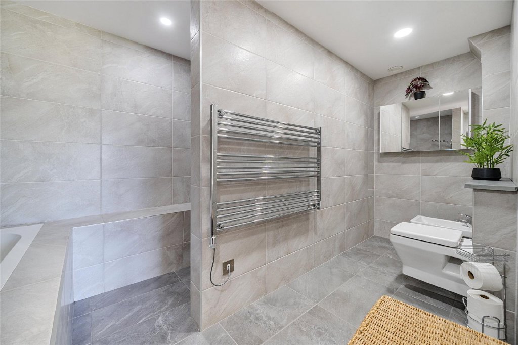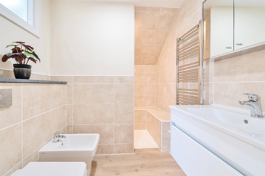 On the ground floor, three generous double bedrooms all benefit from en suite facilities. The principal suite is notably spacious, complete with high-quality built-in furniture, direct access to the garden, and a luxurious en suite bathroom with both bathtub and walk-in shower.
