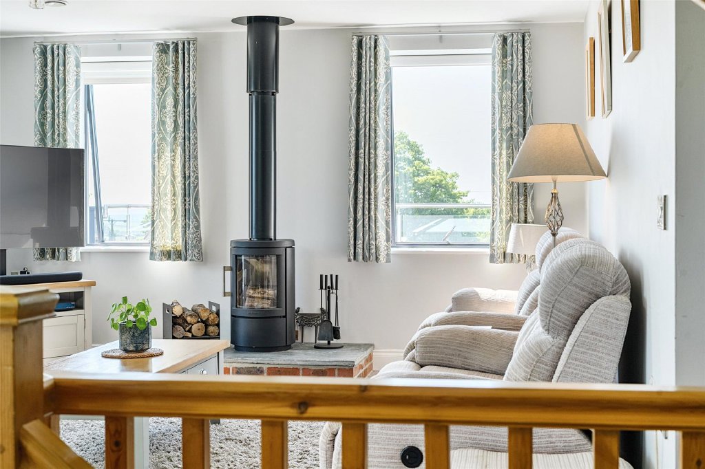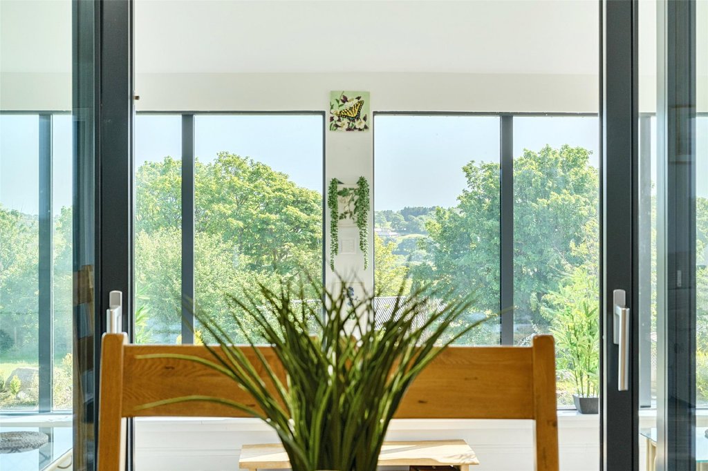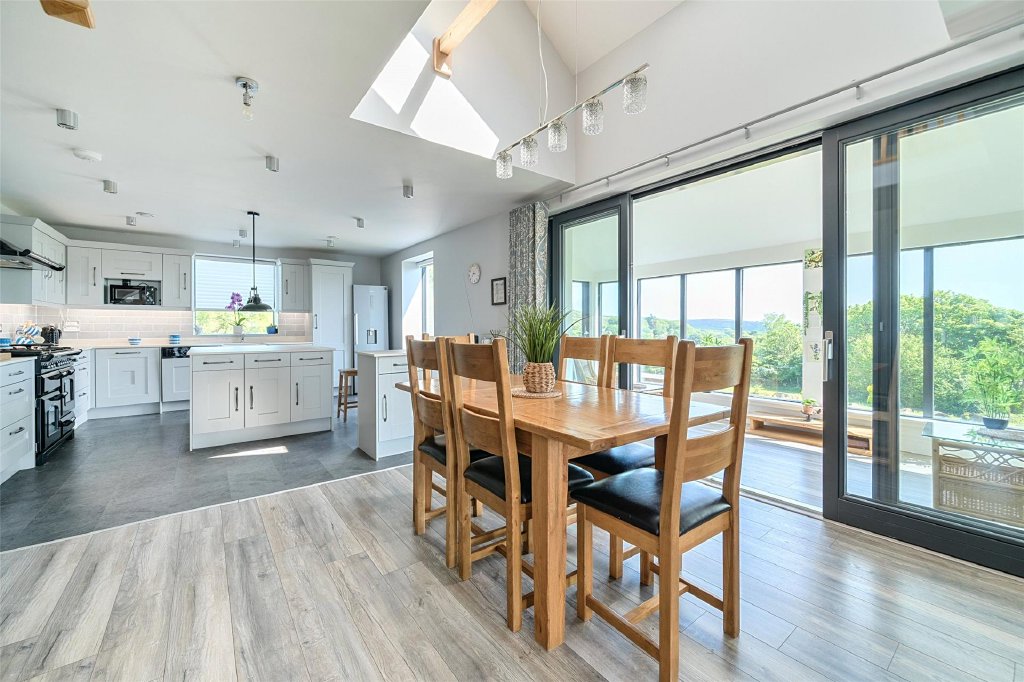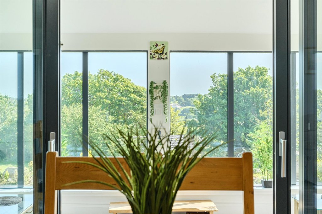 The kitchen transitions smoothly into a spacious dining area, while the dual-aspect living space features a high-output wood burner set on a slate and brick hearth. Double sliding doors lead to a spectacular sunroom, offering uninterrupted views over the gardens and moorland, with balconies at either end—ideal for enjoying warm, sunny days.