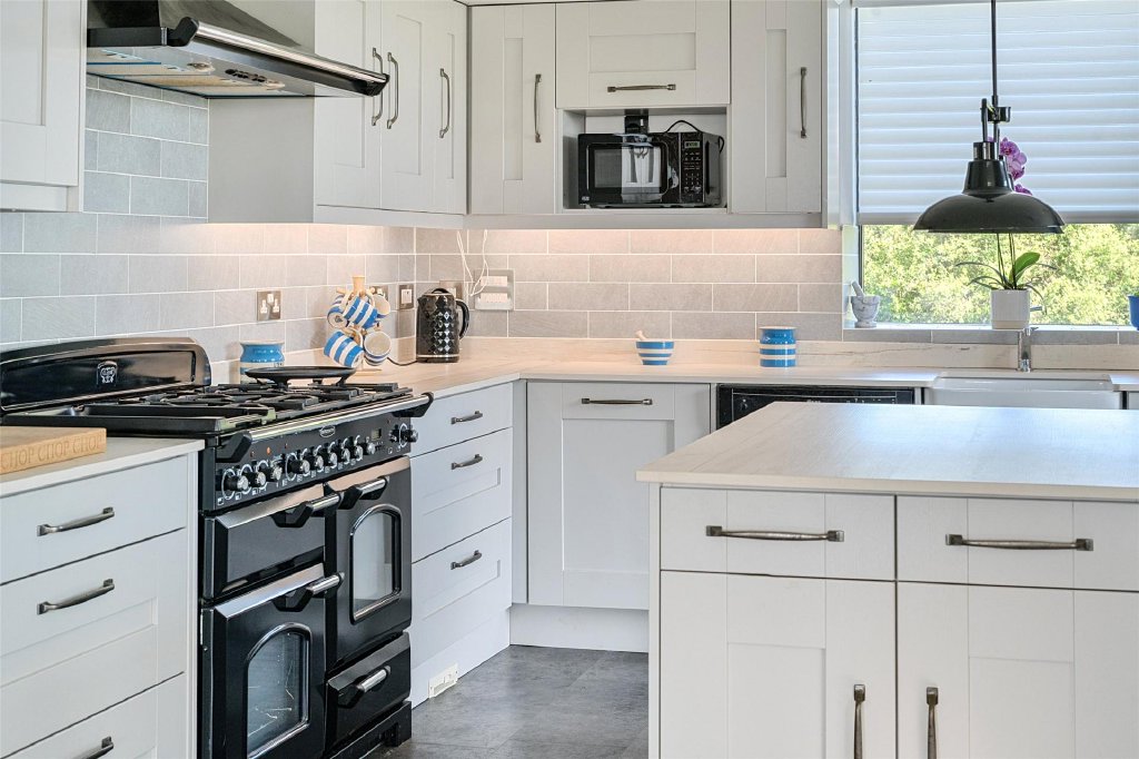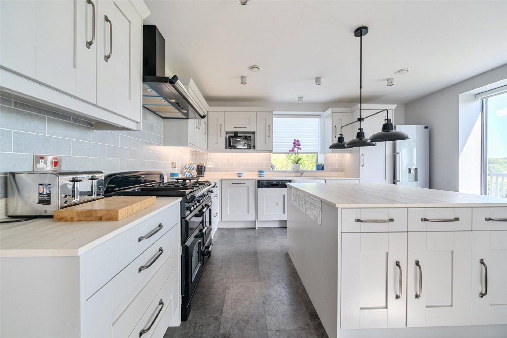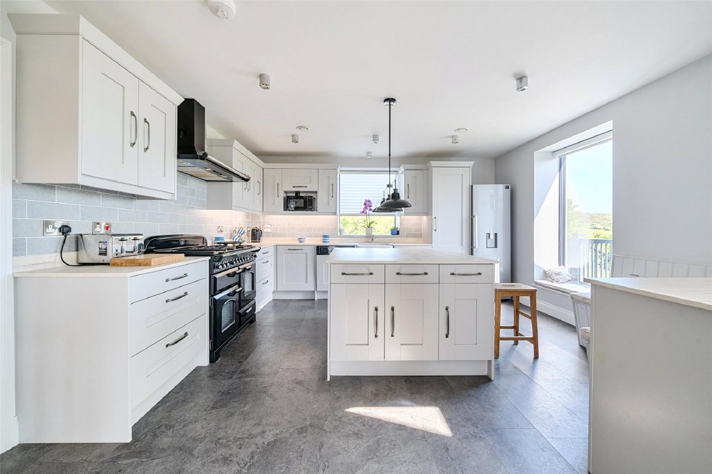 The premium kitchen, finished in light grey tones, includes sleek cabinetry with tall larder units, a central island with breakfast bar seating, and durable Dekton work surfaces with matching upstands. A Belfast sink, under-cabinet lighting, and a combination of recessed and pendant lights enhance the space. Appliances included in the sale are a Rangemaster electric oven with gas hob and extractor, Neff dishwasher, freestanding fridge, and microwave.