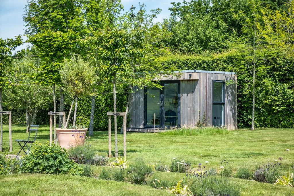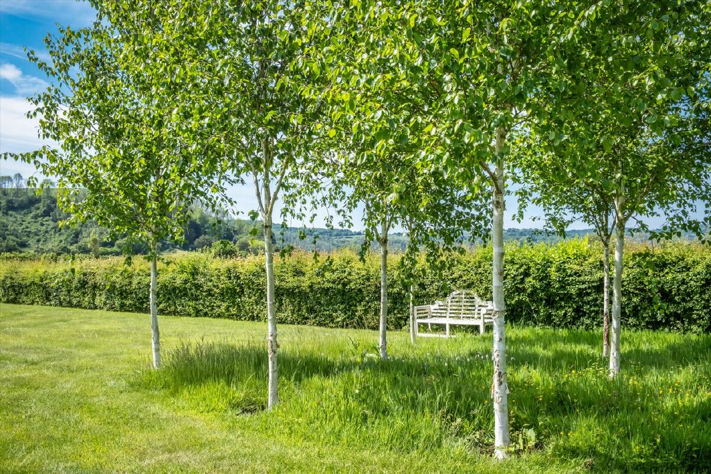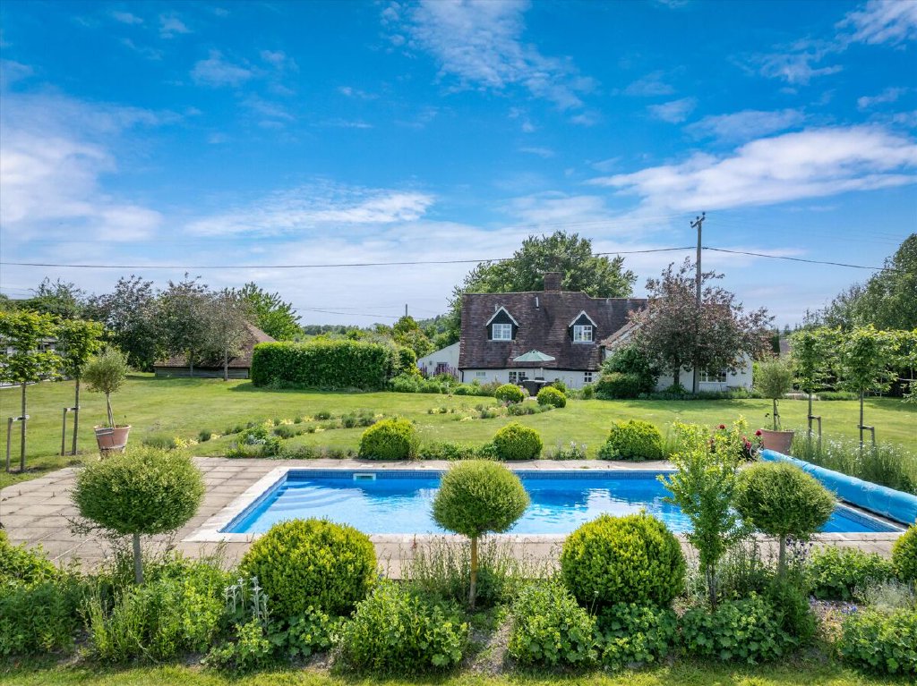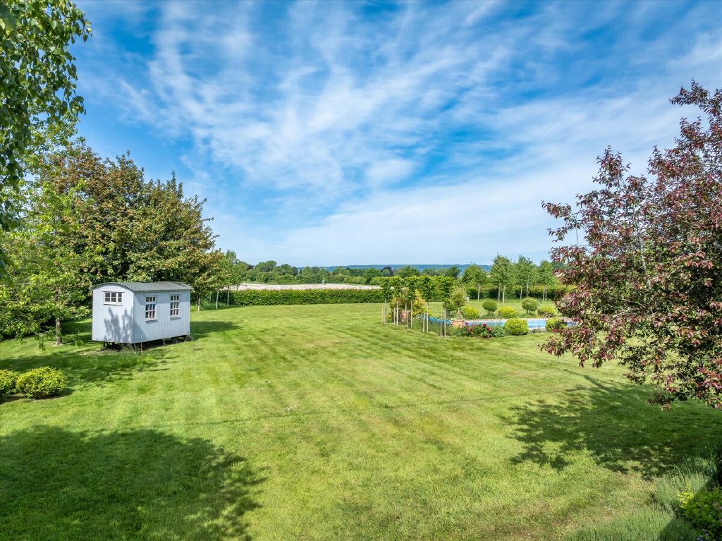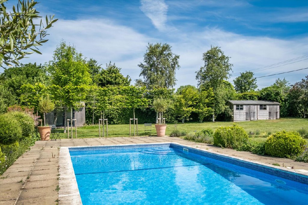 A particular highlight is the outdoor swimming pool, which is sensitively positioned within the garden and maintained by a professional local company. Surrounded by greenery and with views of open sky and countryside, it offers a private and peaceful setting for summer living. The wider gardens are cared for by an experienced gardener familiar with the property, ensuring the grounds remain in excellent condition throughout the seasons.