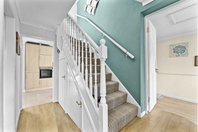 Chain Free Detached Four Bedroom Family Home | Bright Entrance Hall | Downstairs W/C | Two Reception Rooms | Conservatory | Private Mature Garden | Driveway for Multiple Vehicles | Detached Garage | Sought-After Location Nestled in a peaceful and established residential cul-de-sac, this well-maintained four-bed detached family home on Keyes Gardens, Warrington, WA3 6SD offers a spacious corner plot, generous living accommodation, a beautifully landscaped garden, and excellent curb appeal. Perfectly positioned close to local schools, amenities, and transport links, this home is ideal for families seeking space, comfort, and convenience. From the moment you step inside, you’re greeted by a bright and welcoming entrance hallway, and W/C setting the tone for the spacious interior. To the front is a generous lounge providing an inviting space, featuring large windows that allow plenty of natural light. The second reception room to the rear, is also ideal for family gatherings. The hallway has plenty of storage and leads to a large double bedroom with walk in closet The fitted kitchen is thoughtfully designed with ample worktop, a breakfast bar and cupboard space, providing a functional and practical environment for cooking and day-to-day living. The layout flows seamlessly into the conservatory, which overlooks the rear garden—offering the perfect spot to unwind while enjoying views of the outdoors year-round. Upstairs, the property features three bedrooms, each offering comfortable accommodation. There is a modern family shower room offering style and practicality with contemporary fixtures and fittings. Externally, the property sits on a generous plot with a driveway providing off-road parking for multiple vehicles and a detached garage, ideal for storage. The rear garden is a real highlight—a private oasis with a large neatly maintained lawn, and multiple patio areas perfect for relaxing or entertaining during the warmer months.