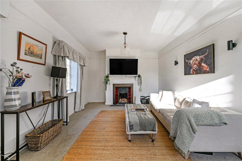 Set within a picturesque village setting, this charming red-brick end-of-terrace period house beautifully combines traditional character with modern touches. Approached via a pretty garden path lined with manicured hedges, the cottage opens into a bright and welcoming living/dining room. Finished in a crisp white palette to enhance the natural light, the space features a red-tiled fireplace, sash-style window, and neutral carpeting. The room’s airy proportions and cosy aesthetic create an inviting environment ideal for both everyday living.