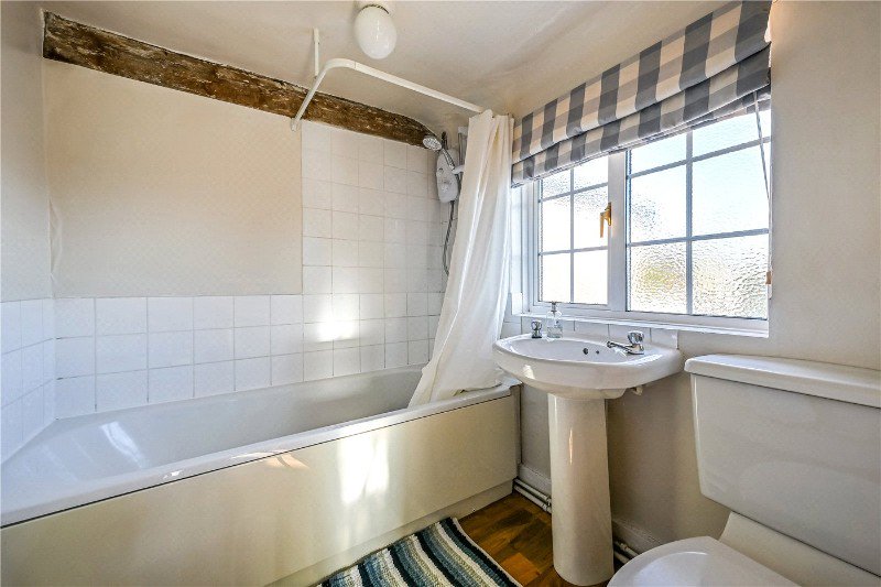 Upstairs, there are two well-proportioned bedrooms, both offering peaceful outlooks and a neutral décor suited to a variety of furnishings. The principal bedroom includes exposed beams, an original fireplace with brick surround, and a lovely view across the garden. The second bedroom is similarly finished and provides a versatile space for guests, a home office, or nursery. The bathroom is minimally presented with white tiling, a full-size bath and overhead shower, pedestal basin, and low-level WC, all set against wood-effect flooring and a backdrop of exposed beam detail.
