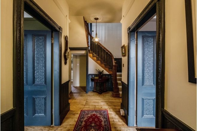 Rare opportunity to purchase this five bedroom end terrace town house, recently lovingly restored to showcase its period features, within walking distance of the city centre of Inverness. Accommodation comprises ~ Main entrance is through wooden double doors into an enclosed porch with original tiled floor and stained glass windows. A further internal front door opens into the main hallway with original wood flooring, ornate door surrounds and dado panels. Off the Hallway to the right is the main living room with impressive bay window, feature fireplace and again with original wood flooring. Opposite the living room is a mirror image dining room again with feature fireplace, bay window and two Victoria Press storage alcoves. Straight ahead from the main hallway is an attractive staircase with original balustrade having been lovingly restored back to its natural beauty. Also on the ground floor is a convenient modernised shower room, kitchen, large bedroom which opens onto a spacious conservatory facing onto the rear garden. The Kitchen features a six burner gas range cooker, granite worktop, double Belfast sink and ample wall and base units in a soft cream coloured wood. On the half landing off the staircase is a beautifully restored bathroom with free standing Victorian style bath and separate shower, tile effect flooring bespoke heated towel rail and painted dado panels.