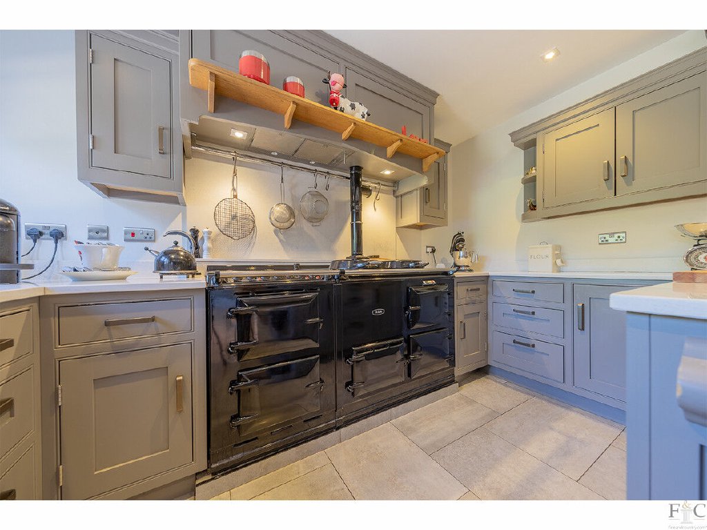 - Bespoke Hallwood kitchen with quartz worktops, twin Belfast sinks, handmade cabinetry, and triple Aga