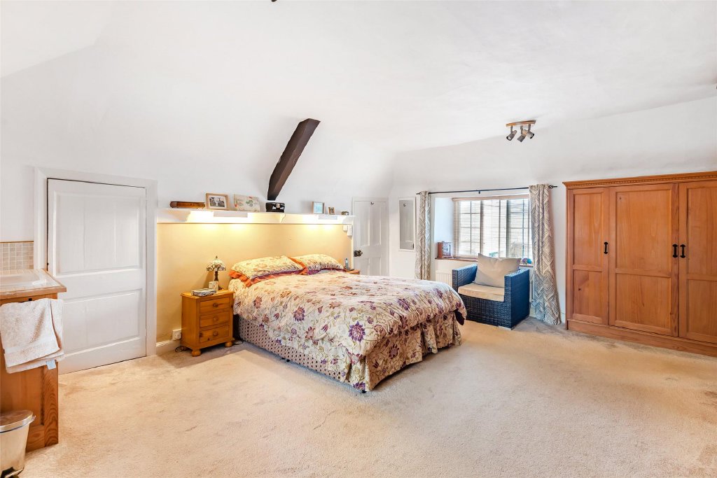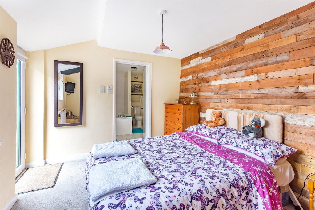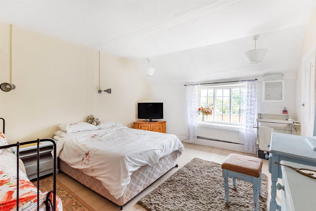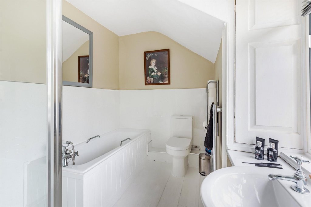 On the first floor, a bright and airy landing provides access to four bedrooms and the family bathroom. The principal bedroom enjoys dual aspects, bespoke fitted wardrobes, and a stylish en-suite shower room with a walk-in shower. Bedrooms two and three are spacious doubles with charming outlooks and vanity basins, while bedroom four offers a cosy single room with built-in bed—ideal as a child’s room or home office. The family bathroom is fitted with a four-piece suite, offering both bath and shower facilities.