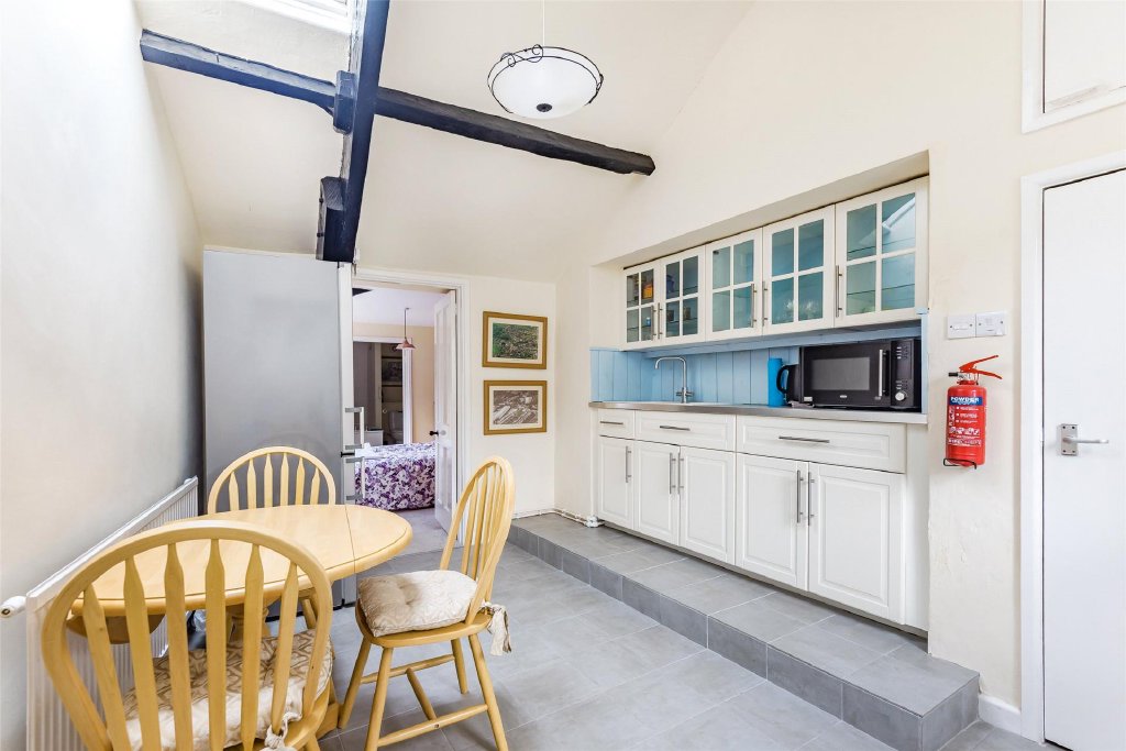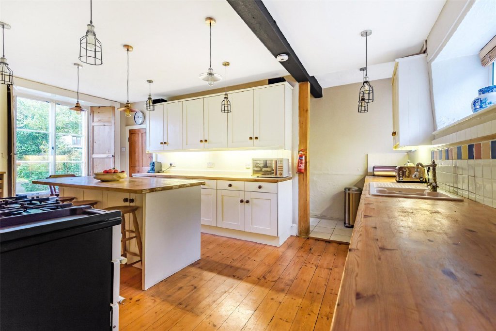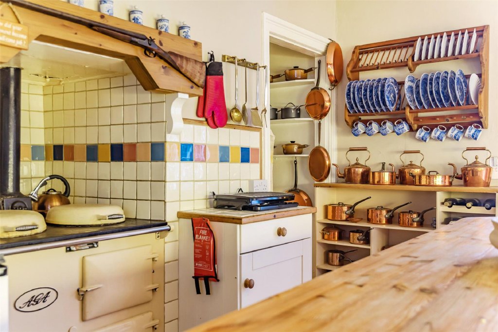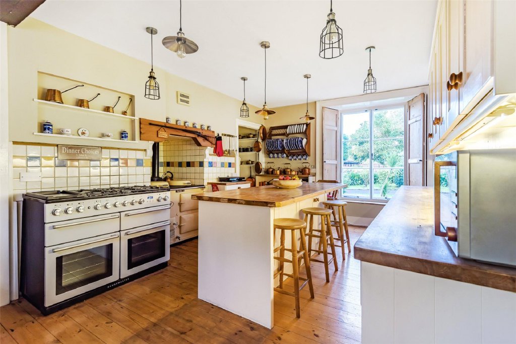 From here, a door leads into the kitchen/breakfast room, which is impressively appointed with classic shaker-style cabinetry, a recessed AGA, central island, and walk-in pantry—an ideal hub for family life and entertaining.