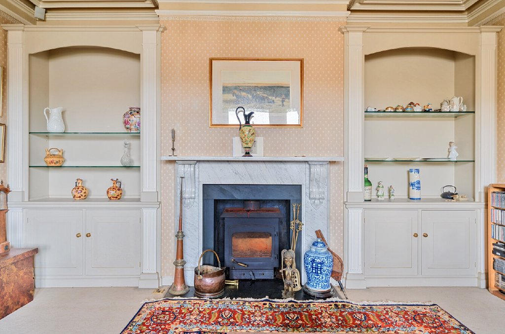 Living Room with large bay window which enjoys views to the front elevation, fire place with marble surround and hearth with inset woodburning stove and shelving on either side.