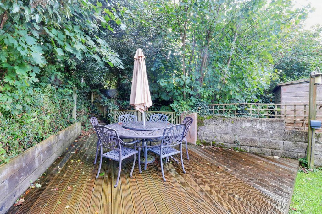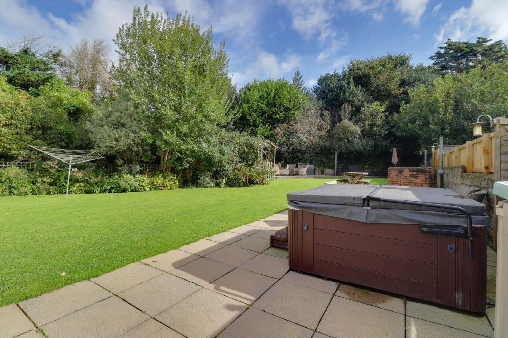 The rear garden is beautifully designed, with a paved patio, hot tub, built-in BBQ, and decked seating area. A gate leads to an enclosed space with a bridge over the brook, custom timber storage, and a covered seating area, all surrounded by a lawn and well-placed shrubs.