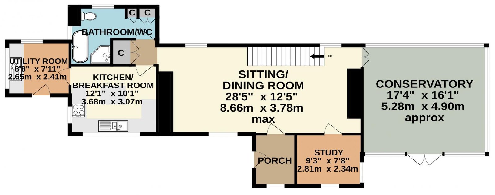 The ground floor offers a spacious lounge/dining room with a multi-fuel burner and an oil fired Aga set within a fireplace with a clome oven. The well equipped kitchen features matching units and includes an integrated dishwasher. A dual aspect study provides a quiet workspace, while the impressive conservatory provides panoramic views over the surrounding gardens and farmland. The ground floor also features a utility room and a family bathroom/WC with both a shower cubicle and a bath.