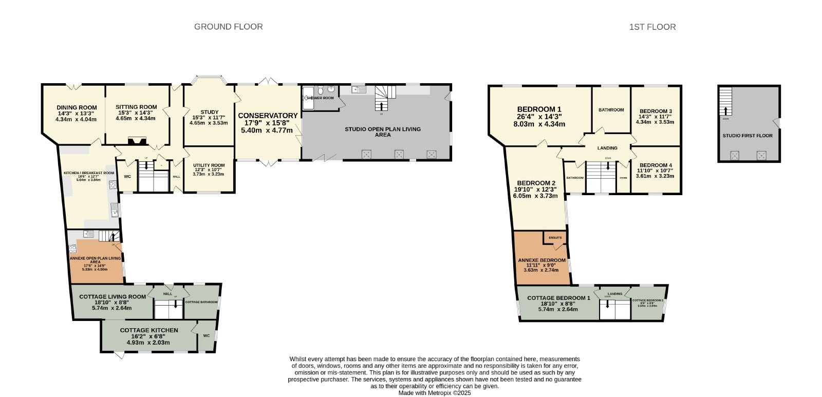 Adjacent to the main living areas is a separate study, which boasts a charming bay window and is ideal for those who work from home. This leads into a large conservatory, a suntrap that bathes in light and provides an ideal spot to relax, enjoy the garden views, or enjoy a morning coffee. The ground floor also includes a useful utility room/dairy room with extra space for white goods, adding to the practicality of the home.