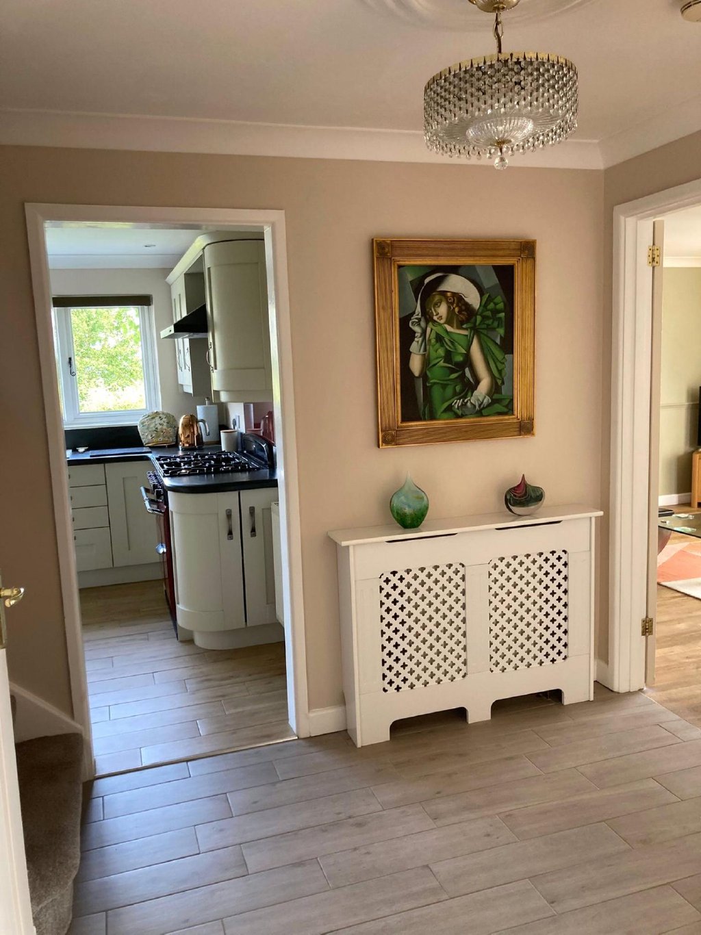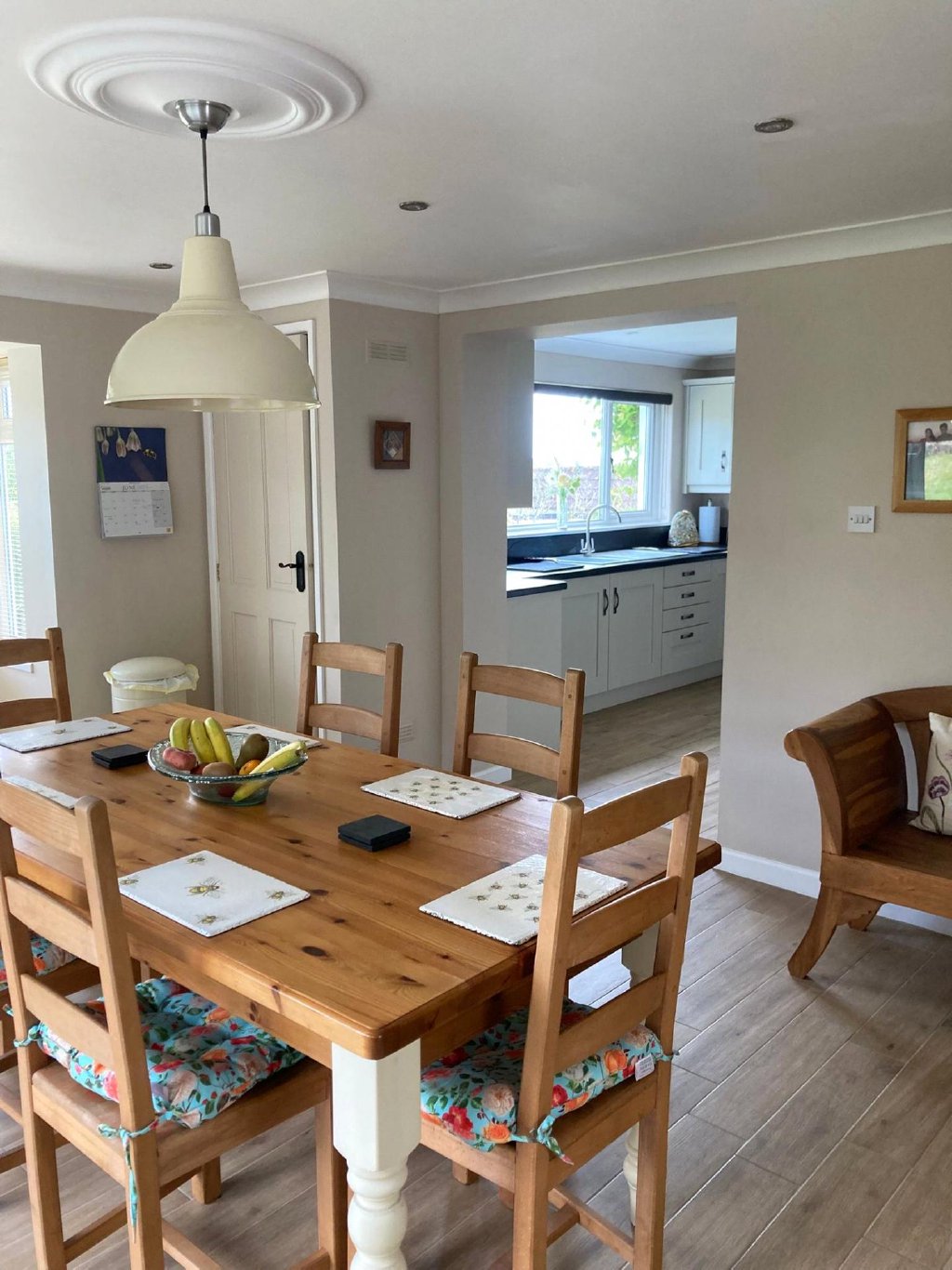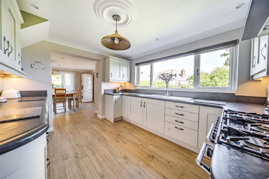 Upon entering, the light-filled hallway welcomes you into the heart of the home. To the front, a charming triple aspect sitting room enjoys far-reaching views across Ashford and beyond to the sea, offering a serene and elevated aspect that enhances the sense of space and tranquillity. The living areas flow effortlessly into a sleek, contemporary kitchen/breakfast room with 40mil bullnose slate worksurfaces, ideal for everyday family life. An extension to the rear has created a stylish formal dining room, complete with French doors opening directly into the rear garden – perfect for entertaining or al fresco dining in the warmer months.