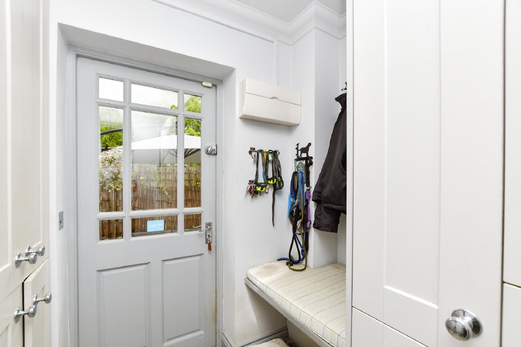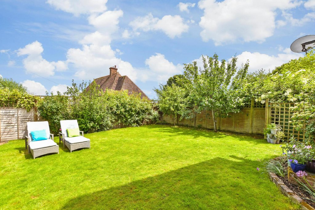 The spacious and secluded rear garden is surrounded by fruit trees, established shrub borders and flower beds and includes a large lawn that is ideal for kids to kick a football around, as well as a private side patio for relaxing in the sunshine and a large terrace for barbecues and al fresco dining.
