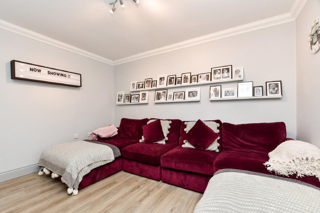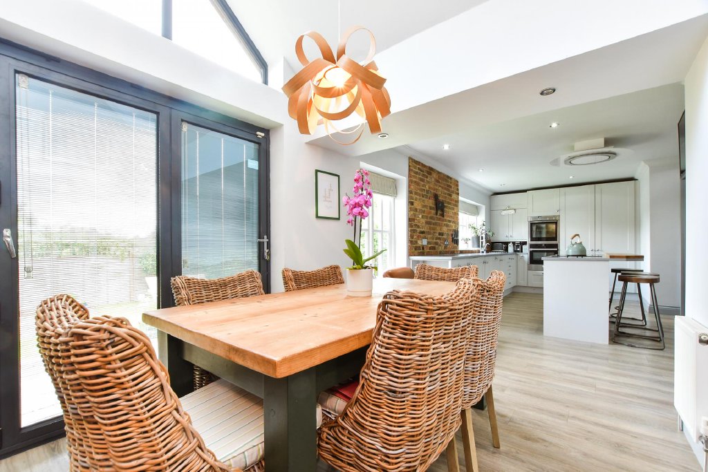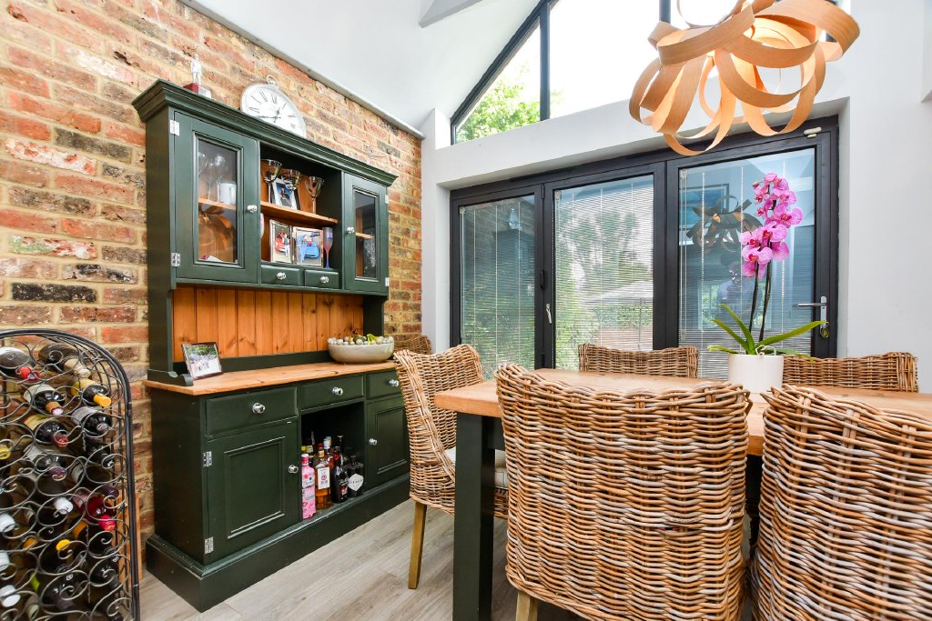 It includes a double height, vaulted ceiling dining area extension with three aluminium bi-fold doors to the rear terrace and when these doors are open you can really feel you are ‘bringing the outdoors inside’. There is also a bespoke trapezoid window above as well as an old brick feature wall. While the impressive new and beautifully equipped kitchen/breakfast room includes a matching brick wall feature and light grey shaker style units.