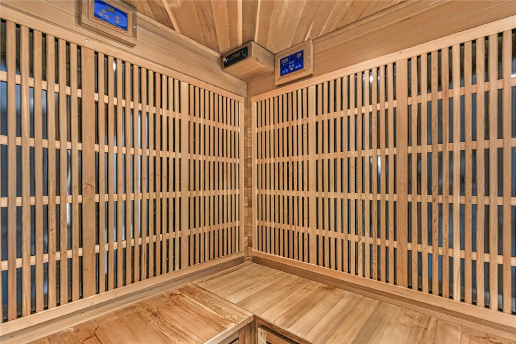 At its heart is the indoor swimming pool, equipped with an endless swimming jet, allowing for continuous exercise against a smooth current, making it perfect for both fitness and relaxation. Adjacent to the pool, a fully equipped gym and sauna provide additional wellness facilities, creating a private spa-like experience within the home.