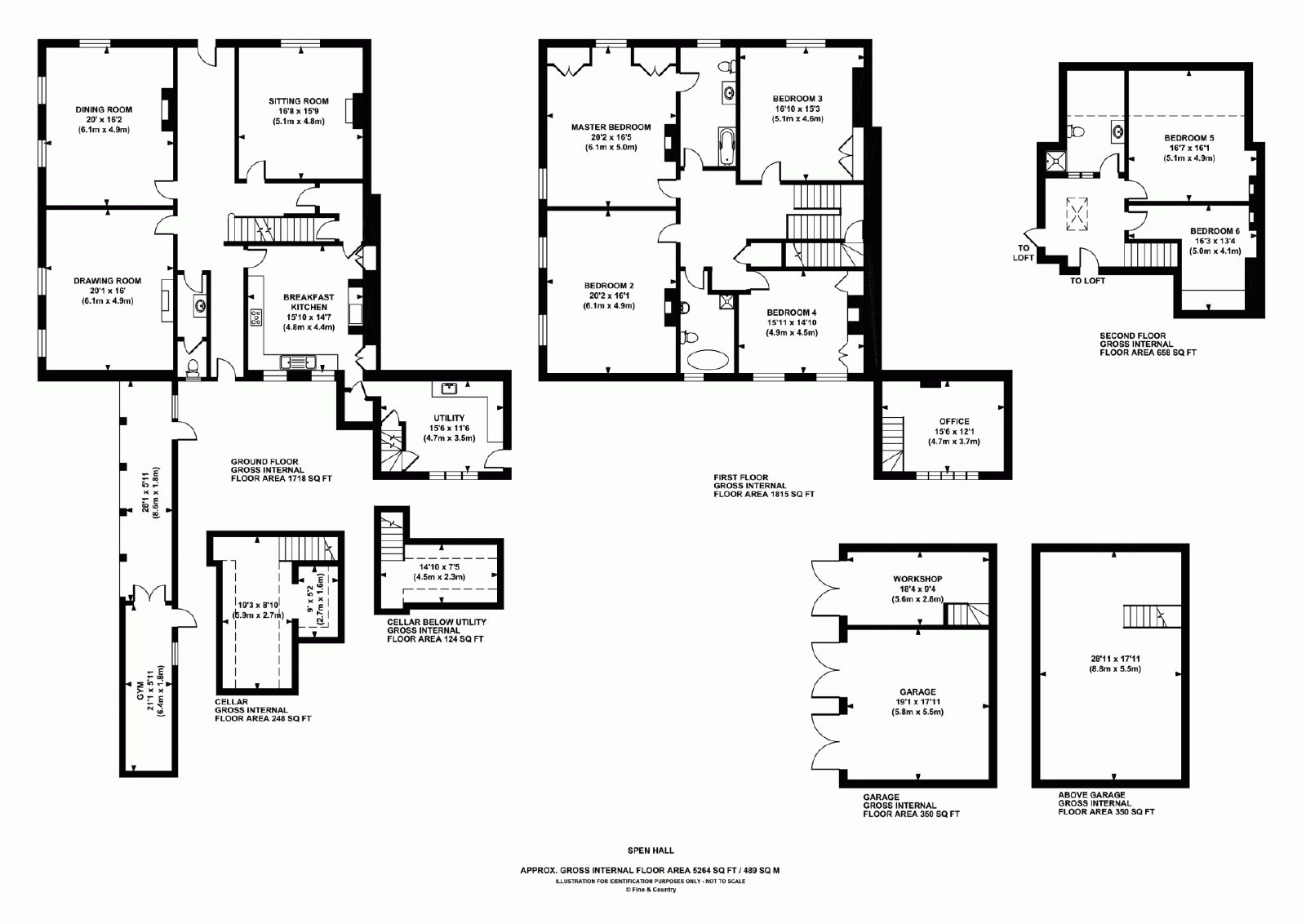 On the second floor are bedrooms five and six, both doubles with exposed beams, fireplaces, and sash windows. A shared shower room serves this floor, along with access to two large loft storage areas.