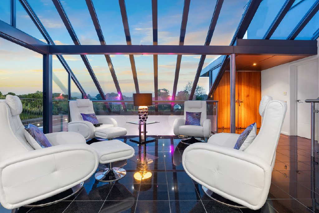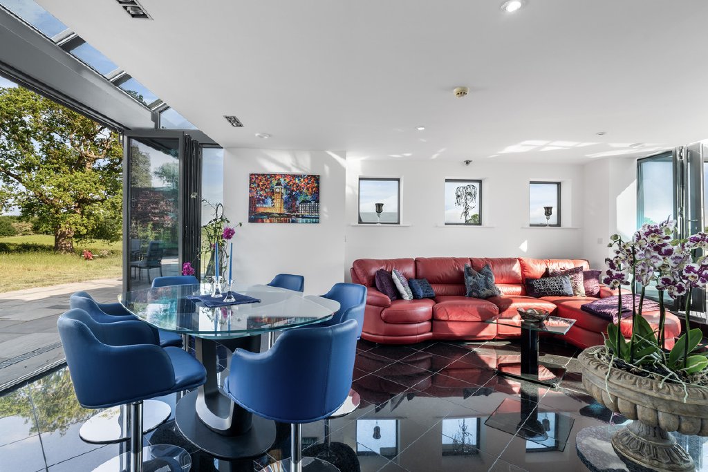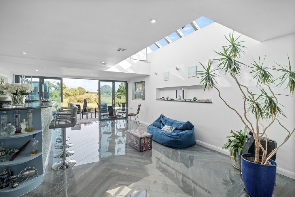 This expansive multi-use space is fully tiled in elegant grey porcelain herringbone, crowned by the glass atrium above which bathes the entire area in natural light. Fullheight six-panel glazed doors open directly onto the lower patio, creating a seamless indoor-outdoor connection. Integrated task uplighting and downlights enhance the ambience.