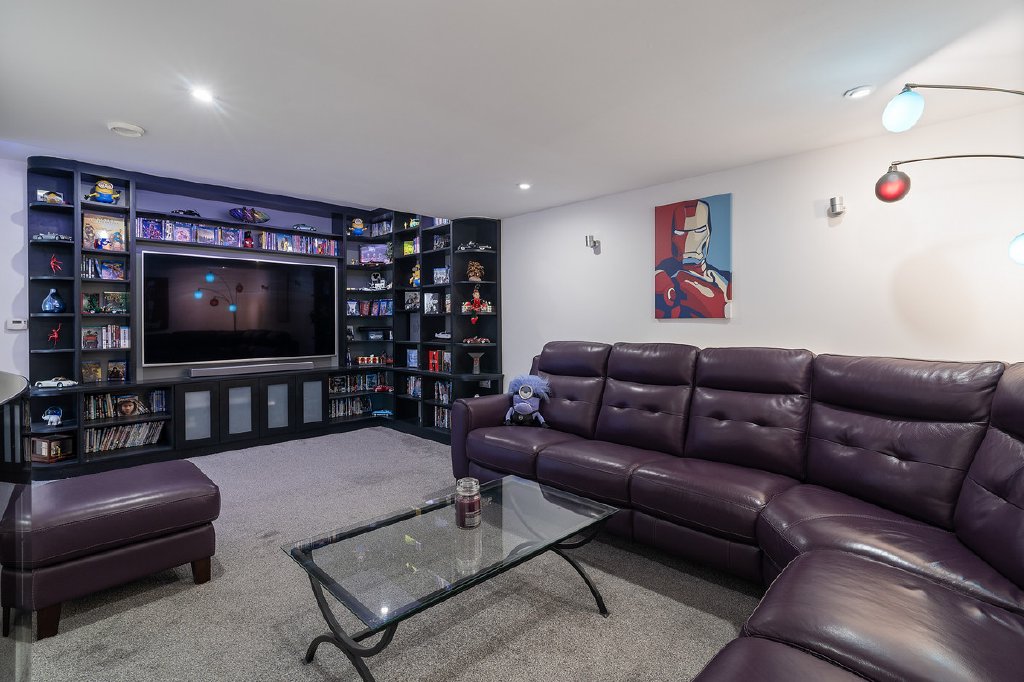A custom-fitted media bar, complete with frosted glass panels, integrated TV sockets, ideal for entertaining.