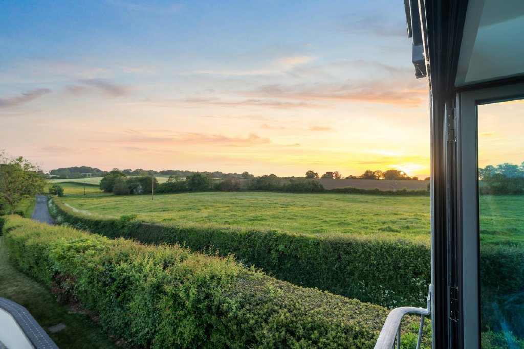 An East facing retreat with panoramic views over the landscaped gardens, wildflower meadow, and open fields beyond. The space features a vaulted ceiling, Velux windows with fitted blinds, and an integral glazed balcony with twin opening windows, drawing in soft afternoon light and incredible views over the grounds and paddocks to the fields beyond.
